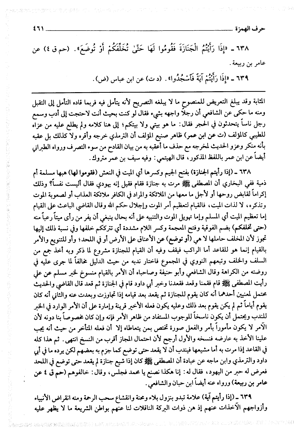 638 - (إذا رأيتم الجنازة) بفتح الجيم وكسرها أي الميت في النعش (فقوموا لها) هبها مسلمة أم ذمية ففي البخاري أن المصطفى صلى الله عليه وسلم مرت به جنازة فقام فقيل له إنه يهودي فقال أليست نفسا ؟ وذلك إكراما لقابض روحها أو لأجل ما معها من الملائكة والمراد في الكافر ملائكة العذاب أو لصعوبة الموت وتذكره ، لا لذات الميت ، فالقيام لتعظيم أمر الموت وإجلال حكم الله.