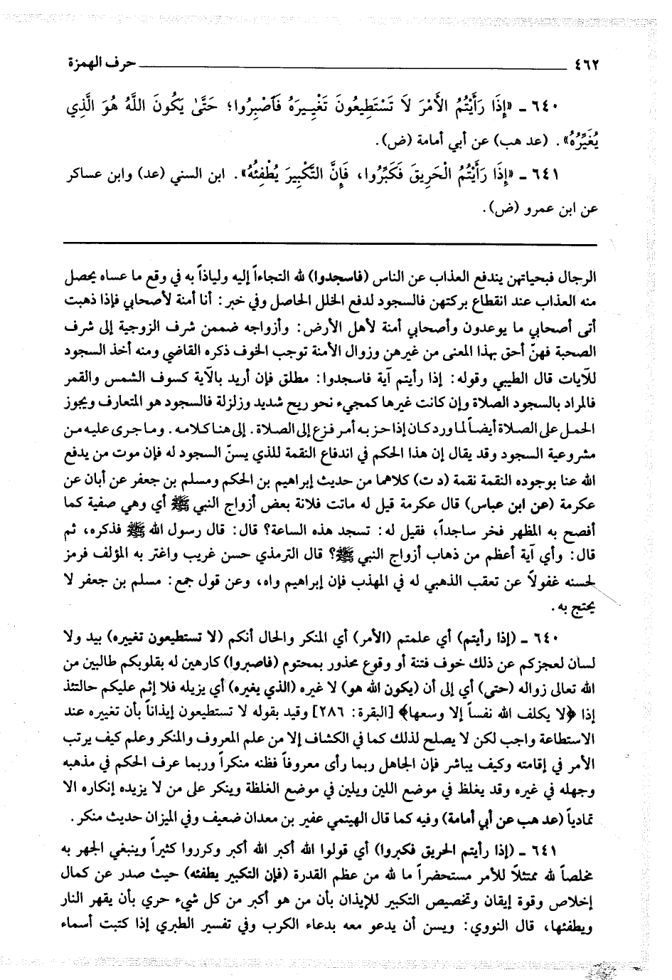 641 - (إذا رأيتم الحريق فكبروا) أي قولوا الله أكبر الله أكبر وكرروا كثيرا وينبغي الجهر به مخلصا لله ممتثلا للأمر مستحضرا ما لله من عظيم القدرة (فإن التكبير يطفئه) حيث صدر عن كمال إخلاص وقوة إيقان وتخصيص التكبير للإيذان بأن من هو أكبر من كل شئ حري بأن يقهر النار ويطفئها.
