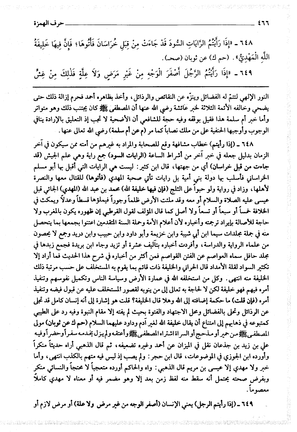 قال ابن كثير : ليست هي الرايات التي أقبل بها أبو مسلم الخراساني فأسلب بها دولة بني أمية بل رايات تأتي صحبة المهدي (فأتوها) للقتال معها والنصرة لأهلها وزاد في رواية ولو حبوا على الثلج (فإن فيها خليفة الله) محمد بن عبد الله (المهدي) الجائي قبل عيسى عليه الصلاة والسلام أو معه وقد ملئت الأرض ظلما وجورا فيملؤها قسطا وعدلا ويمكث في الخلافة خمسا أو سبعا أو تسعا ولا أصل كما قال المؤلف لقول القرطبي إن ظهوره يكون بالمغرب ولا حاجة للأصالة بإيراد ترجمته وأخباره لأن أعلام الأمة وحملة السنة المتقدمين اعتنوا بجمعها بما يتحصل منه في جملة مجلدات سيما ابن أبي شيبة وابن خزيمة وأبو داود وابن حبيب وابن دريد وجمع لا يحصون من علماء الرواية والدراسة وأفردت أخباره يتآليف عشرة أو تزيد وجاء ابن بريدة فجمع زبدها في مجلد حافل سماه العواصم عن الفتن القواصم فمن أكثر من أخباره في شرح هذا الحديث فما أراد إلا