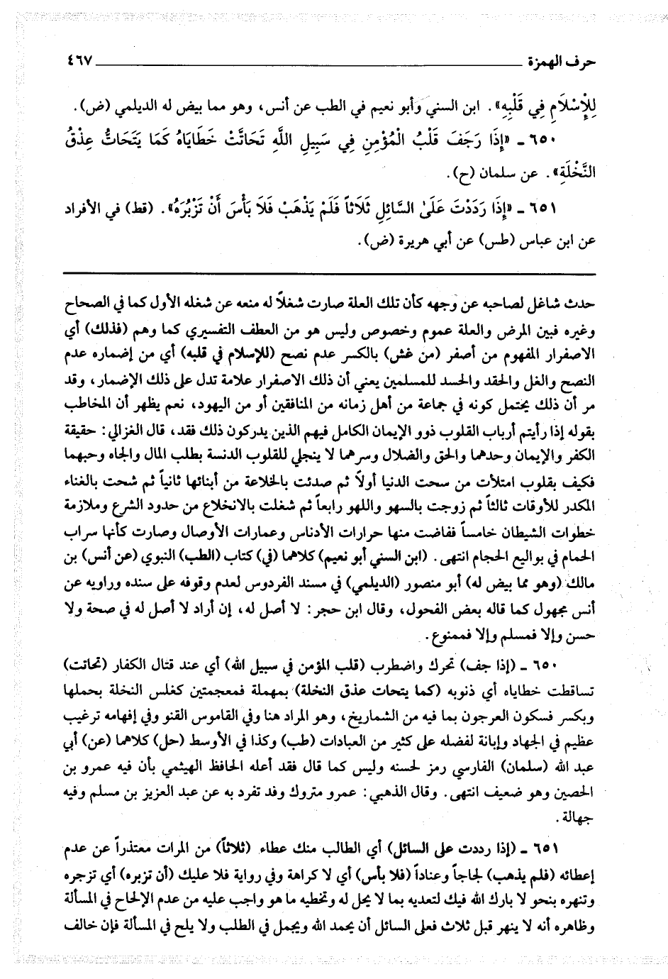 650 - (إذا رجف) تحرك واضطرب (قلب المؤمن في سبيل الله) أي عند قتال الكفار (تحاتت) تساقطت (خطاياه) أي ذنوبه (كما يتحات عذق النخلة) بمهملة فمعجمتين كغلس النخلة بحملها وبكسر فسكون العرجون بما فيه من الشماريخ وهو المراد هنا وفي القاموس القنو وفي إفهامه ترغيب عظيم في الجهاد وإبانة لفضله على كثير من العبادات (طب) وكذا في الأوسط (حل) كلاهما (عن) أبي عبد الله (سلمان) الفارسي رمز لحسنه وليس كما قال فقد أعله الحافظ الهيتمي بأن فيه عمرو بن الحصين وهو ضعيف انتهى وقال الذهبي عمرو متروك وقد تفرد به عن عبد العزيز بن مسلم وفيه جهالة.