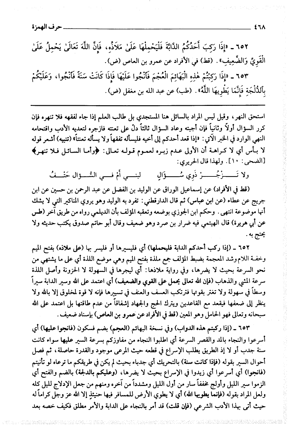 653 - (إذا ركبتم هذه الدواب) وفي نسخة البهائم (العجم) بضم فسكون (فانجوا عليها) أي أسرعوا والنجاء بالمد والقصر السرعة أي اطلبوا النجاء من مفاوزكم بسرعة السير عليها سواء كانت سنة جدب أو لا إذ الطريق يطلب الإسراع في قطعه حيث المرعى موجود والقدرة حاصلة ثم فصل أحوال السير بقوله (فإذا كانت سنة) بالتحريك أي جدباء بحيث لم يكن في طريقكم ما ترعاه لو تأنيتم (فانجوا) أي أسرعوا أي زيدوا في الإسراع بحيث لا يضرها (وعليكم بالدلجة) بالضم والفتح أي الزموا سير الليل وأولج مخففا سار من أول الليل ومشددا من آخره ومنهم من جعل الإدلاج لليل كله ولعل المراد بقوله (فإنما يطويها الله) أي لا يطوي الأرض للمسافر فيها حينئذ إلا الله عز وجل إكراما له حيث أتى بهذا الأدب الشرعي (فإن قلت) قد أمر بالنجاء على الدابة والأمر مطلق فكيف خصه بعد