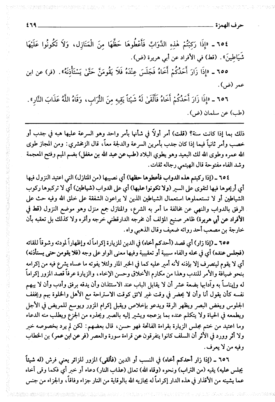 654 - (إذا ركبتم هذه الدواب فأعطوها حظها) أي نصيبها (من المنازل) التي اعتيد النزول فيها أي أريحوها فيها لتقوى على السير (ولا تكونوا عليها) أي على الدواب (شياطين) أي لا تركبوها ركوب الشياطين أو لا تستعملوها استعمال الشياطين الذين لا يراعون الشفقة على خلق الله وفيه حث على الرفق بالدواب والنهي عن مخالفة ما أمر به الشرع.
