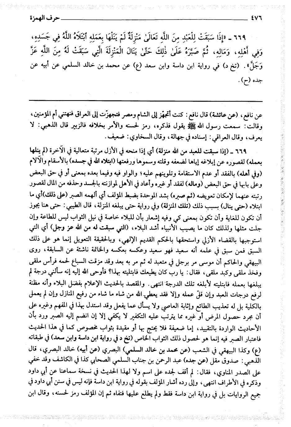 669 - (إذا سبقت للعبد من الله منزلة) أي إذا منحه في الأزل مرتبة متعالية في الآخرة (لم ينلها بعمله) لقصوره عن إبلاغه إياها لضعفه وقلته وسموها ورفعتها (ابتلاه الله في جسده) بالأسقام والآلام