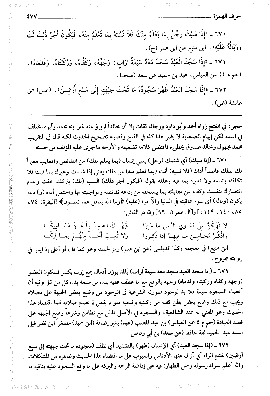 671 - (إذا سجد العبد سجد معه سبعة آراب) بالمد بوزن أفعال جمع إرب بكسر فسكون العضو (وجهه وكفاه وركبتاه وقدماه) وجهه بالرفع مع ما عطف عليه بدل من سبعة بدل كل من كل وفيه أن أعضاء السجود سبعة فلا بد لوجود صورته الشرعية في الوجود من وضع بعض الجبهة على مصلاه ويجب مع ذلك وضع بعض بطن كفيه من ركبتيه وقدميه فلو لم يفعل لم تصح صلاته كما اقتضاه هذا الحديث وهو المفتي به عند الشافعية والسجود في الأصل تذلل مع تطامن وشرعا وضع الجبهة على قصد العبادة (حم م 4 عن العباس) بن عبد المطلب (عبد) بغير إضافة (ابن حميد) مصغرا ابن نضر قيل اسمه عبد الحميد ثقة حافظ (عن سعد) ابن أبي وقاص.
