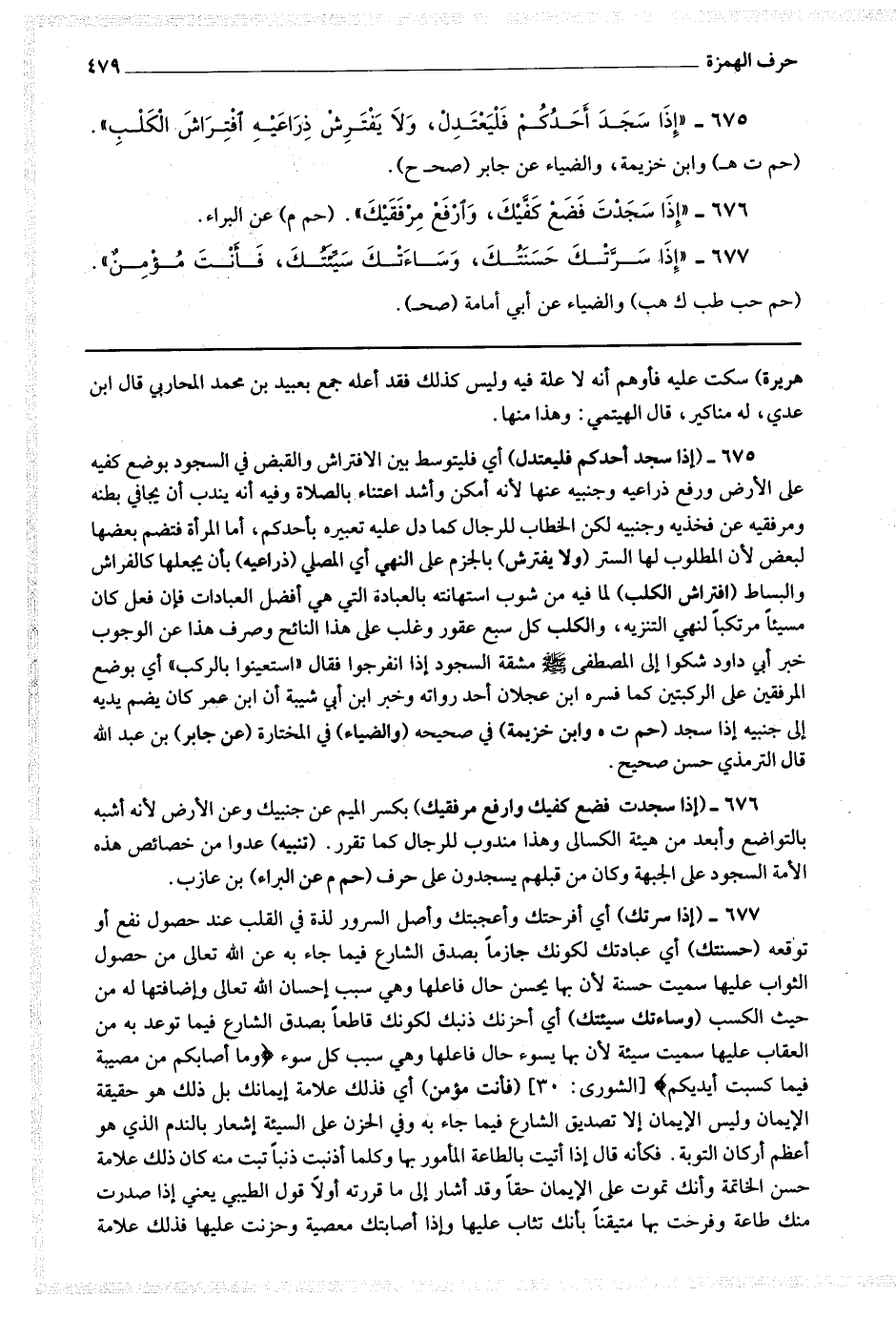 676 - (إذا سجدت فضع كفيك وارفع مرفقيك) بكسر الميم عن جنبيك وعن الأرض لأنه أشبه بالتواضع وأبعد من هيئة الكسالى وهذا مندوب للرجال كما تقرر (تنبيه) عدوا من خصائص هذه الأمة السجود على الجبهة وكان من قبلهم يسجدون على حرف (حم م عن البراء) بن عازب.