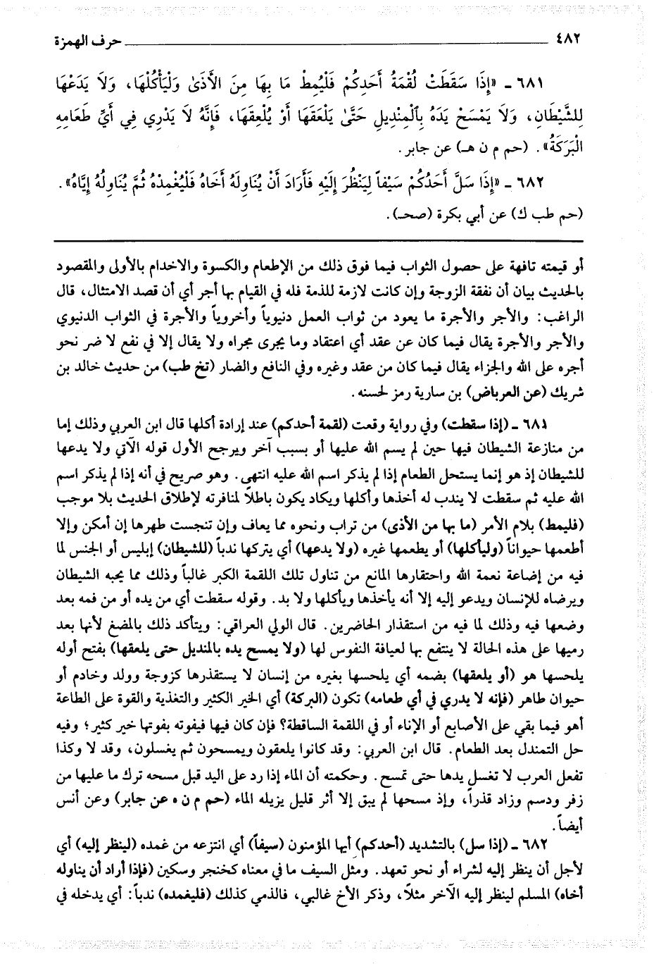 681 - (إذا سقطت) وفي رواية وقعت (لقمة أحدكم) عند إرادة أكلها قال ابن العربي : وذلك إما من منازعة الشيطان فيها حين لم يسم الله عليها أو بسبب آخر ويرجح الأول قوله الآتي ولا يدعها للشيطان إذ هو إنما يستحل الطعام إذا لم يذكر اسم الله عليه انتهى وهو صريح في أنه لم يذكر اسم الله عليه ثم سقطت لا يندب له أخذها وأكلها ويكاد يكون باطلا لمنافرته لإطلاق الحديث بلا موجب (فليمط) بلام الأمر (ما بها من الأذى) من تراب ونحوه مما يعاف وإن تنجست طهرها إن أمكن وإلا أطعمها حيوانا (وليأكلها) أو يطعمها غيره (ولا يدعها) أي يتركها ندبا (للشيطان) إبليس أو الجنس لما فيه من إضاعة نعمة الله واحتقارها والمانع من تناول تلك اللقمة الكبر غالبا وذلك مما يحبه الشيطان ويرضاه للإنسان ويدعو إليه إلا أنه يأخذها ويأكلها ولا بد.