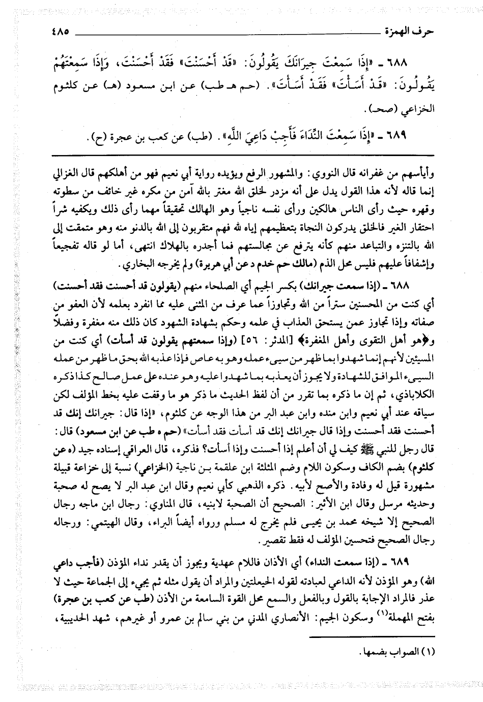 688 - (إذا سمعت جيرانك) بكسر الجيم أي الصلحاء منهم (يقولون قد أحسنت فقد أحسنت) أي كنت من المحسنين سترا من الله وتجاوزا عما عرف من المثني عليه مما انفرد بعلمه لأن العفو من صفاته وإذا تجاوز عمن يستحق العذاب في علمه وحكم بشهادة الشهود كان ذلك منه مغفرة وفضلا و * (هو أهل التقوى وأهل المغفرة) * (وإذا سمعتهم يقولون قد أسأت) أي كنت من المسيئين لأنهم إنما شهدوا بما ظهر من سئ عمله وهو به عاص فإذا عذبه الله بحق ما ظهر من عمله السئ الموافق للشهادة ولا يجوز أن يعذبه بما شهدوا عليه وهو عنده على عمل صالح كذا ذكره الكلاباذي ثم إن ما ذكره مما تقرر من أن لفظ الحديث ما ذكر هو ما وقفت عليه بخط المؤلف لكن سياقه عند أبي نعيم وابن منده وابن عبد البر من هذا الوجه عن كلثوم إذا قال جيرانك إنك قد أحسنت فقد أحسنت وإذا قال جيرانك إنك قد أسأت فقد أسأت.
