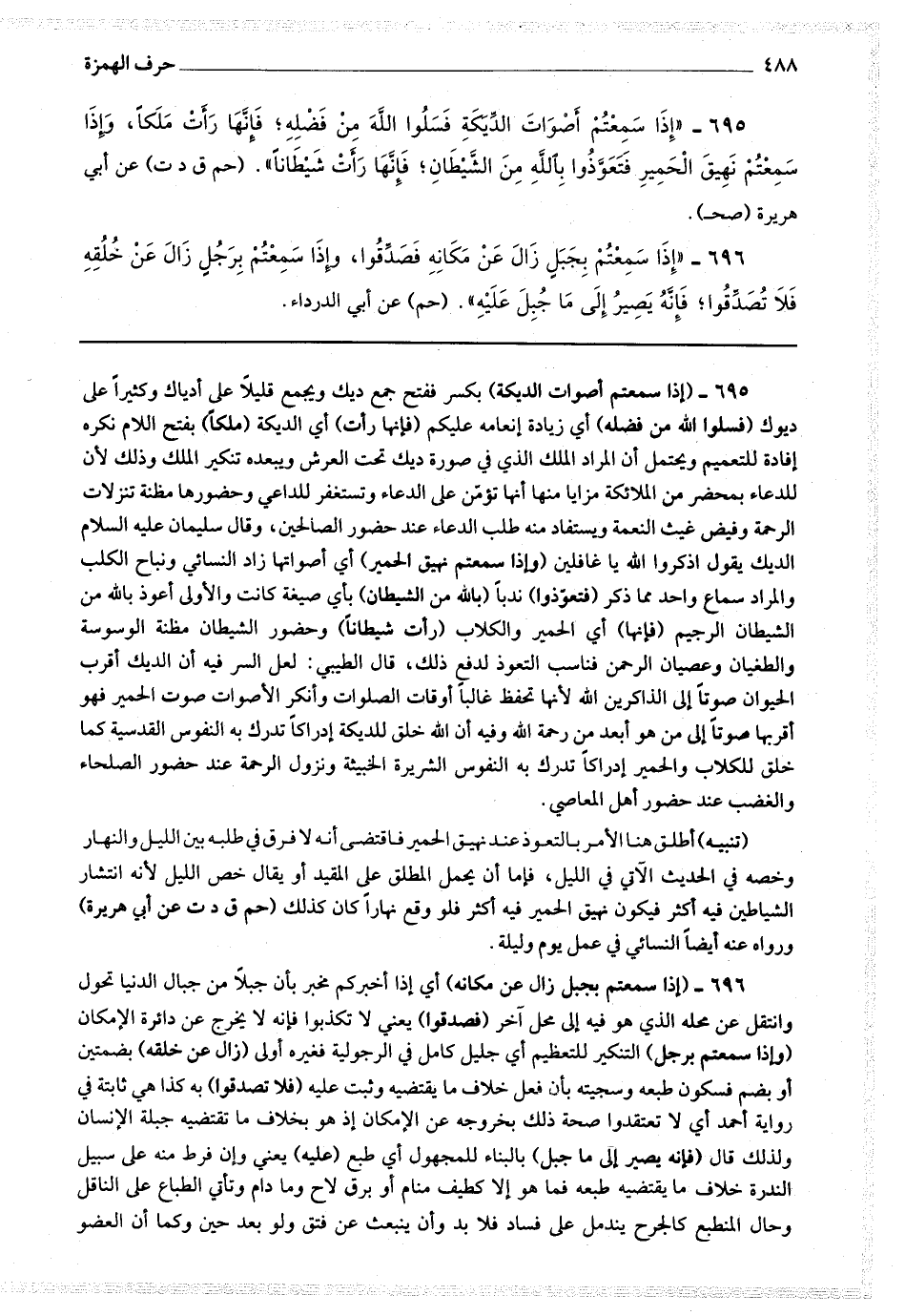 695 - (إذا سمعتم أصوات الديكة) بكسر ففتح جمع ديك ويجمع قليلا على أدياك وكثيرا على ديوك (فسلوا الله من فضله أي زيادة إنعامه عليكم (فإنها رأت) أي الديكة (ملكا) بفتح اللام نكرة إفادة للتعميم ويحتمل أن المراد الملك الذي في صورة ديك تحت العرش ويبعده تنكير الملك وذلك لأن للدعاء بمحضر من الملائكة مزايا منها أنها تؤمن على الدعاء وتستغفر للداعي وحضورها مظنة تنزيلات الرحمة وفيض غيث النعمة ويستفاد منه طلب الدعاء عند حضور الصالحين وقال سليمان عليه السلام الديك يقول اذكروا الله يا غافلين (وإذا سمعتم نهيق الحمير) أي أصواتها زاد النسائي ونباح الكلب والمراد سماع واحد مما ذكر (فتعوذوا) ندبا (بالله من الشيطان) بأي صيغة كانت والأولى أعوذ بالله من الشيطان الرجيم (فإنها) أي الحمير والكلاب (رأت شيطانا) وحضور الشيطان مظنة الوسوسة والطغيان وعصيان الرحمن فناسب التعوذ لدفع ذلك.