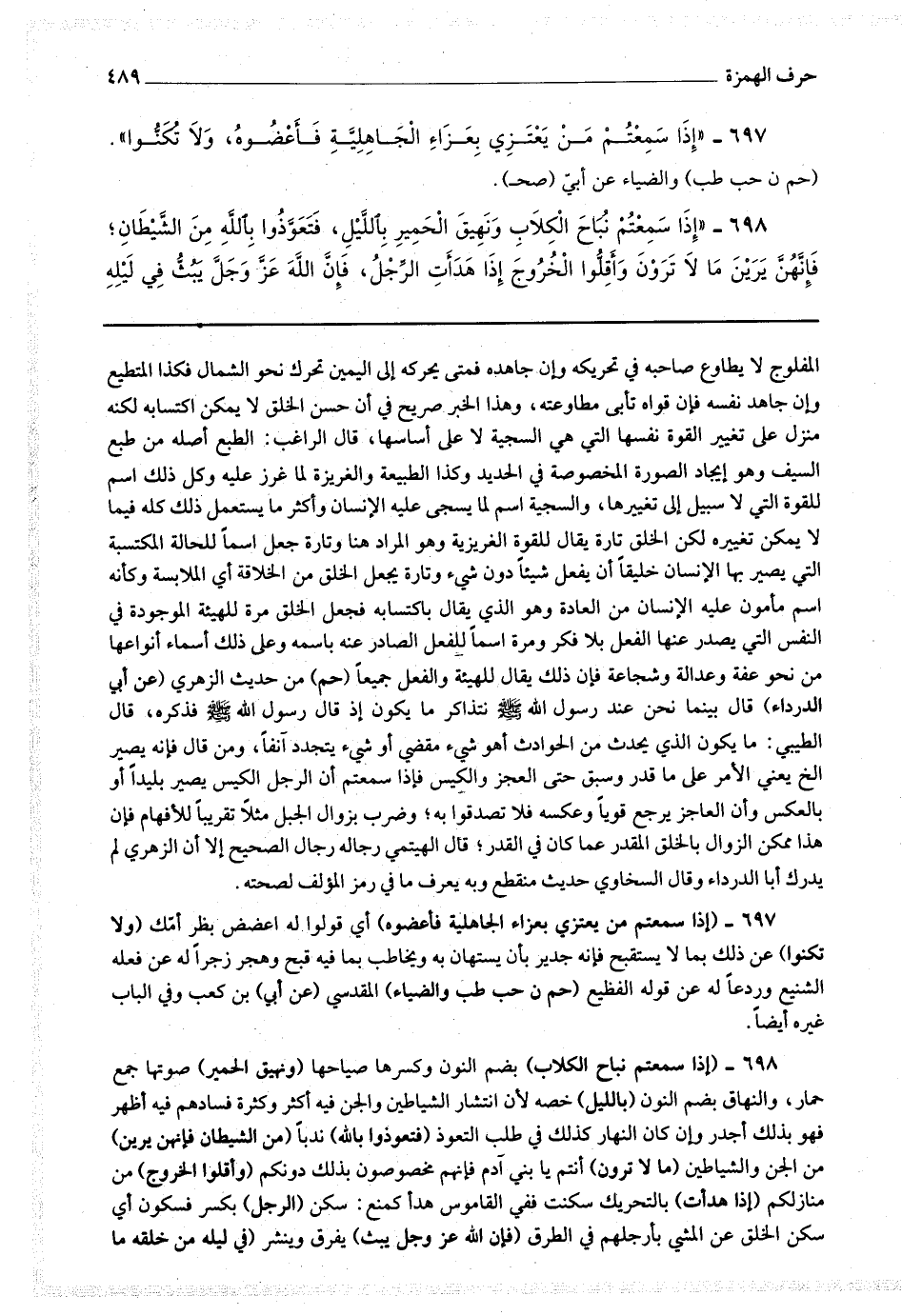 698 - (إذا سمعتم نباح الكلاب) بضم النون وكسرها صياحه (ونهيق الحمير) صوتها جمع حمار ، والنهاق بضم النون (بالليل) خصه لأن انتشار الشياطين والجن فيه أكثر وكثرة فسادهم فيه أظهر فهو بذلك أجدر وإن كان النهار كذلك في طلب التعوذ (فتعوذوا بالله) ندبا (من الشيطان فإنهن يرين) من الجن والشياطين (ما لا ترون) أنتم يا بني آدم فإنهم مخصوصون بذلك دونكم (وأقلوا الخروج) من منازلكم (إذا هدأت) بالتحريك سكنت ففي القاموس هدأ كمنع : سكن (الرجل) بكسر فسكون أي سكن الخلق عن المشي بأرجلهم في الطرق (فإن الله عز وجل يبث) يفرق وينشر (في ليله من خلقه ما
