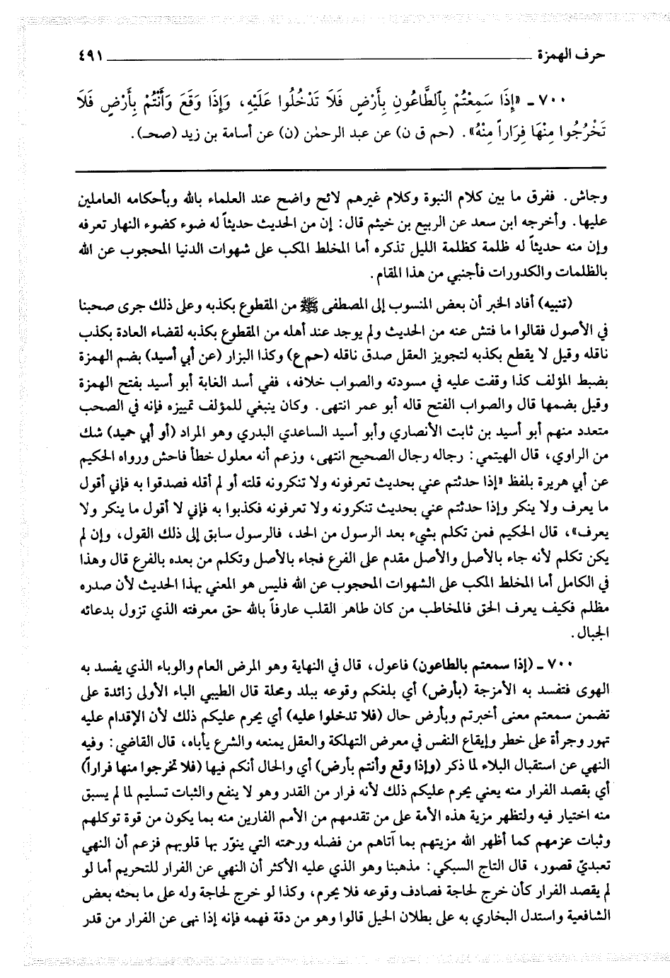 700 - (إذا سمعتم بالطاعون) فاعول ، قال في النهاية وهو المرض العام والوباء الذي يفسد به الهوى فتفسد به الأمزجة (بأرض) أي بلغكم وقوعه ببلد ومحلة.