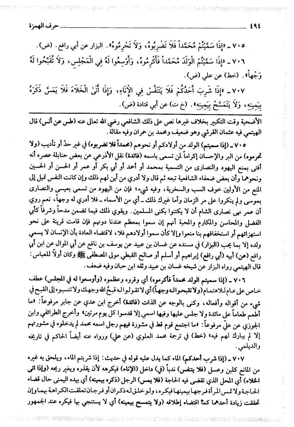 705 - (إذا سميتم) الولد من أولادكم أو نحوهم (محمدا فلا تضربوه) في غير حد أو تأديب (ولا تحرموه) من البر والإحسان إكراما لمن تسمى باسمه (فائدة) نقل الأذرعي عن بعض حنابلة عصره أنه أفتى بمنع اليهود والنصارى من التسمية بمحمد أو أحمد أو أبي بكر أو عمر أو الحسن أو الحسين ونحوهما وأن بعض ضعفاء الشافعية تبعه ثم قال ولا أدري من أين لهم ذلك وإن كانت النفس تميل إلى المنع من الأولين خوف السب والسخرية ، وفيه شي ، فإن من اليهود من تسمى بعيسى والنصارى