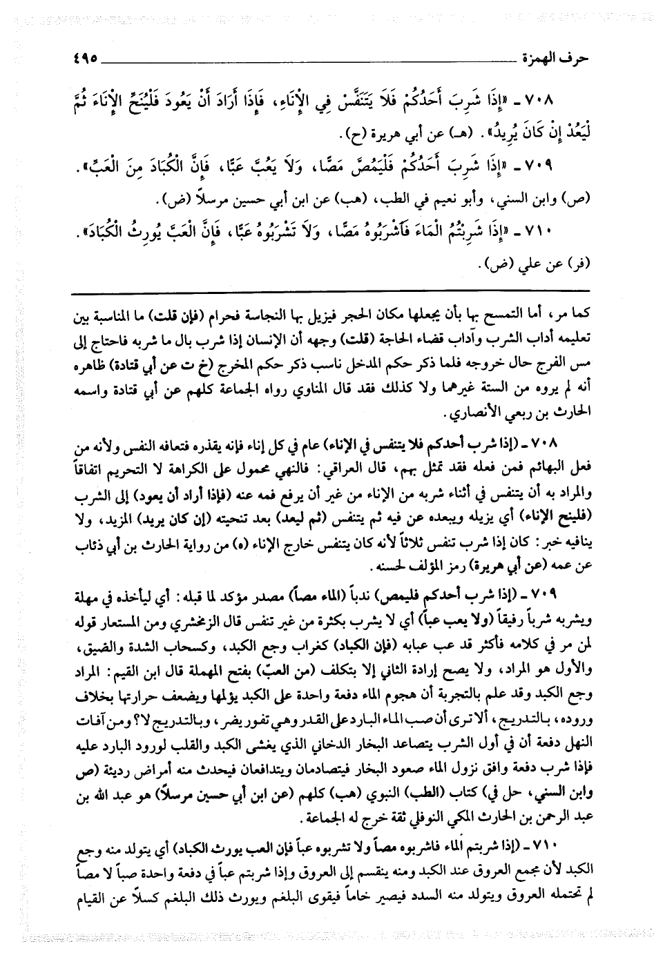 708 - (إذا شرب أحدكم فلا يتنفس في الإناء) عام في كل إناء فإنه يقذره فتعافه النفس ولأنه من فعل البهائم فمن فعله فقد تمثل بهم ، قال العراقي : فالنهي محمول على الكراهة لا التحريم اتفاقا والمراد به أن يتنفس في أثناء شربه من الإناء من غير أن يرفع فمه عنه (فإذا أراد أن يعود) إلى الشرب (فلينح الإناء) أي يزيله ويبعده عن فيه ثم يتنفس (ثم ليعد) بعد تنحيته (إن كان يريد) المزيد ، ولا ينافيه خبر : كان إذا شرب تنفس ثلاثا لأنه كان يتنفس خارج الإناء (ه) من رواية الحارث بن أبي ذئاب عن عمه (عن أبي هريرة) رمز المؤلف لحسنه.