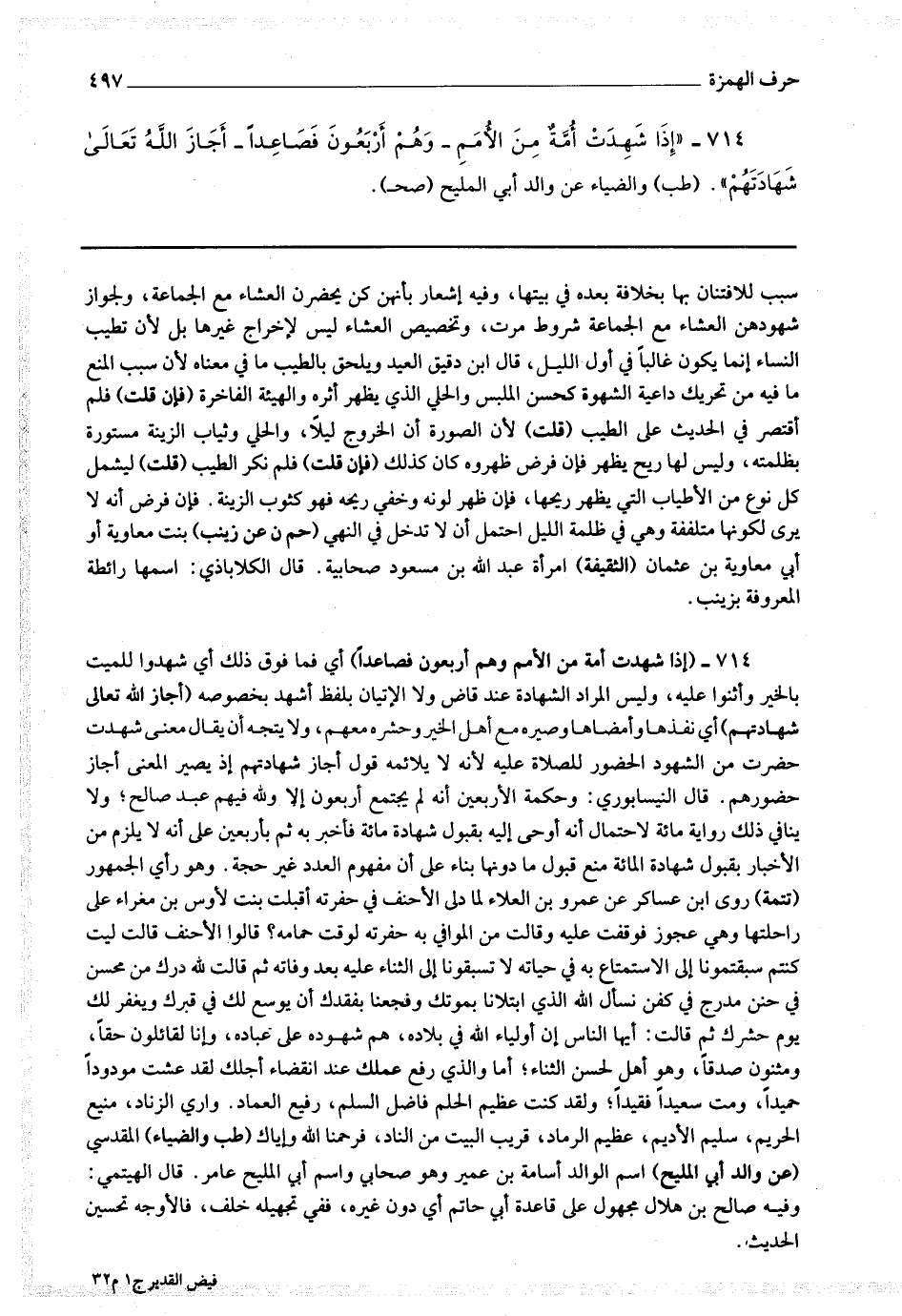 راحلتها وهي عجوز فوقفت عليه وقالت من الموافي به حفرته لوقت حمامه ؟ قالوا الأحنف قالت ليت كنتم سبقتمونا إلى الاستمتاع به في حياته لا تسبقونا إلى الثناء عليه بعد وفاته ثم قالت لله درك من محسن في حنن مدرج في كفن نسأل الله الذي ابتلانا بموتك وفجعنا بفقدك أن يوسع لك في قبرك ويغفر لك يوم حشرك ثم قالت أيها الناس : إن أولياء الله في بلاده ، هم شهوده على عباده ، وإنا لقائلون حقا ، ومثنون صدقا ، وهو أهل لحسن الثناء ، أما والذي رفع عملك عند انقضاء أجلك لقد عشت مودودا حميدا ، ومت سعيدا فقيدا ، ولقد كنت عظيم الحلم فاضل السلم ، رفيع العماد ، واري الزناد ، منيع الحريم ، سليم الأديم ، عظيم الرماد ، قريب البيت من الناد ، فرحمنا الله وإياك (طب والضياء) المقدسي (عن والد أبي المليح) اسم الوالد أسامة بن عمير وهو صحابي واسم أبي المليح عامر.