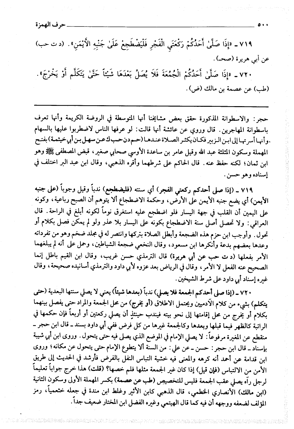 719 - (إذا صلى أحدكم ركعتي الفجر) أي سنته (فليضطجع) ندبا وقيل وجوبا (على جنبه الأيمن) أي يضع جنبه الأيمن على الأرض ، وحكمة الاضطجاع ألا يتوهم أن الصبح رباعية ، وكونه على اليمين أن القلب في جهة اليسار فلو اضطجع عليه استغرق نوما لكونه أبلغ في الراحة.