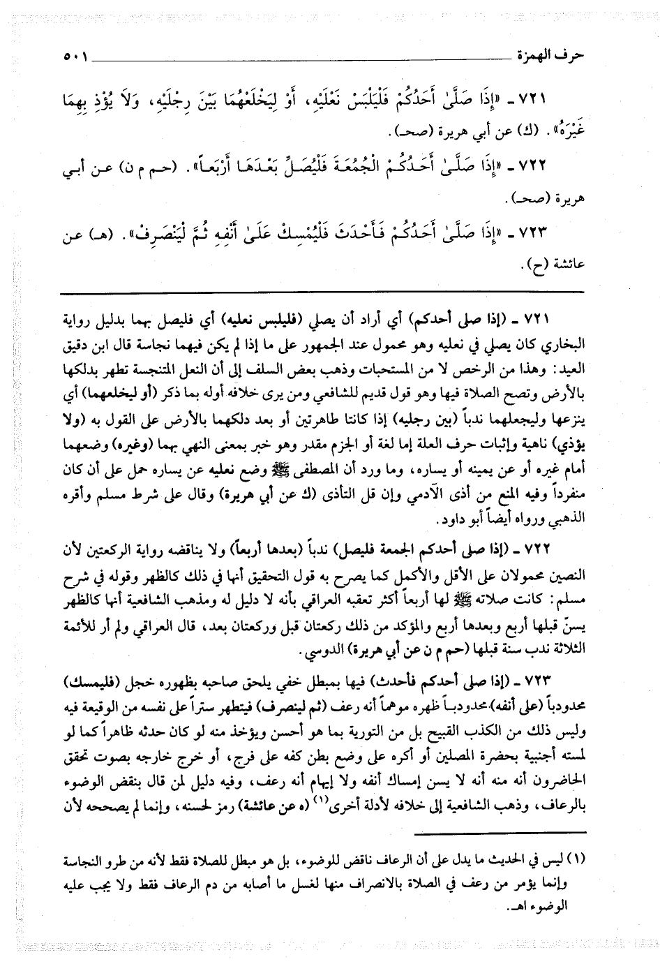 721 - (إذا صلى أحدكم) أي أراد أن يصلي (فليلبس نعليه) أي فليصل بهما بدليل رواية البخاري كان يصلي في نعليه وهو محمول عند الجمهور على ما إذا لم يكن فيهما نجاسة قال ابن دقيق العيد : وهذا من الرخص لا من المستحبات وذهب بعض السلف إلى أن النعل المتنجسة تطهر بدلكها بالأرض وتصح الصلاة فيها وهو قول قديم للشافعي ومن يرى خلافه أوله بما ذكر (أو ليخلعهما) أي ينزعهما وليجعلهما ندبا (بين رجليه) إذا كانتا طاهرتين أو بعد دلكهما بالأرض على القول به (ولا يؤذي) ناهية وإثبات حرف العلة إما لغة أو الجزم مقدر وهو خبر بمعنى النهي بهما (وغيره) وضعهما أمام غيره أو عن يمينه أو يساره ، وما ورد أن المصطفى صلى الله عليه وسلم وضع نعليه عن يساره حمل على أن كان منفردا وفيه المنع من أذى الآدمي وإن قل التأذي (ك عن أبي هريرة) وقال على شرط مسلم وأقره الذهبي ورواه أيضا أبو داود.