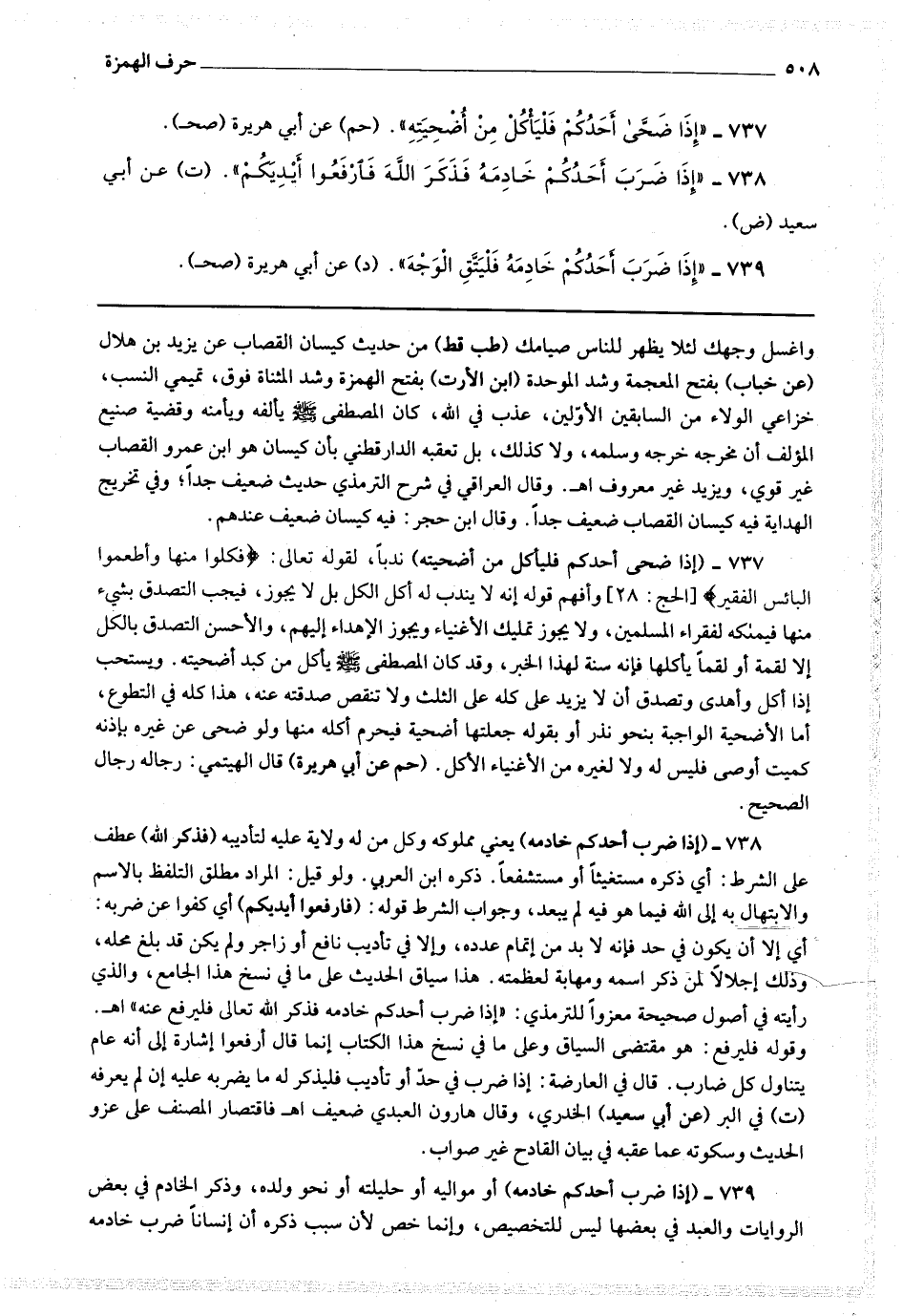 739 - (إذا ضرب أحدكم خادمه) أو مواليه أو حليلته أو نحو ولده ، وذكر الخادم في بعض الروايات والعبد في بعضها ليس للتخصيص ، وإنما خص لأن سبب ذكره أن إنسانا ضرب خادمه