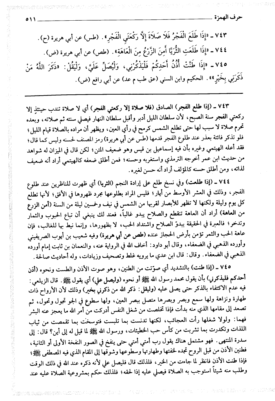 744 - (إذا طلعت) وفي نسخ طلع على إرادة النجم (الثريا) أي ظهرت للناظرين عند طلوع الفجر ، وذلك في العشر الأوسط من أيار ، فليس المراد بطلوعها مجرد ظهورها في الأفق ، لأنها تطلع كل يوم وليلة ولكنها لا تظهر للأبصار لقربها من الشمس في نيف وخمسين ليلة من السنة (أمن الزرع من العاهة) أراد أن العاهة تنقطع والصلاح يبدو غالبا ، فعند ذلك ينبغي أن تباع الحبوب والثمار وتدخر ، فالعبرة في الحقيقة ببدو الصلاح واشتداد الحب ، لا بظهورها ، وإنما نيط بها الغالب ، فإن عاهة الحب والثمر تؤمن بأرض الحجاز عنده (طص عن أبي هريرة) وفيه شعيب بن أيوب الصريفيني وأورده الذهبي في الضعفاء ، وقال أبو داود : أخاف الله في الرواية عنه ، والنعمان بن ثابت إمام أورده الذهبي في الضعفاء وقال : قال ابن عدي ما يرويه غلط وتصحيف وزيادات ، وله أحاديث صالحة.