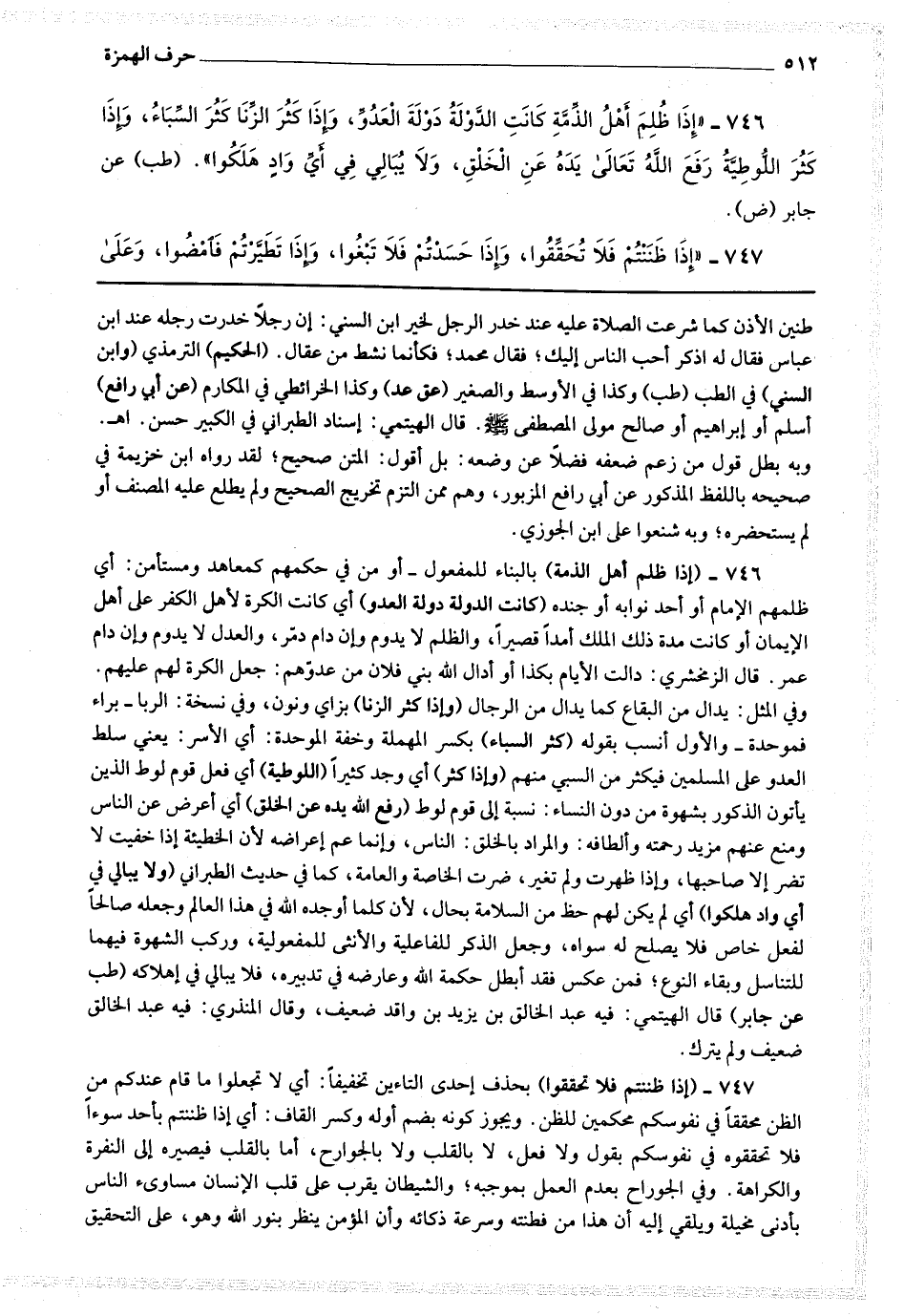 747 - (إذا ظننتم فلا تحققوا) بحذف إحدى التاءين تخفيفا أي لا تجعلوا ما قام عندكم من الظن محققا في نفوسكم محكمين للظن ، ويجوز كونه بضم أوله وكسر القاف أي إذا ظننتم بأحد سوءا فلا تحققوه في نفوسكم بقول ولا فعل ، لا بالقلب ولا بالجوارح ، أما بالقلب فيصيره إلى النفرة والكراهة ، وفي الجوارح بعدم العمل بموجبه ، والشيطان يقرب على قلب الإنسان مساوئ الناس بأدنى مخيلة ويلقى إليه أن هذا من فطنته وسرعة ذكائه وأن المؤمن ينظر بنور الله وهو على التحقيق