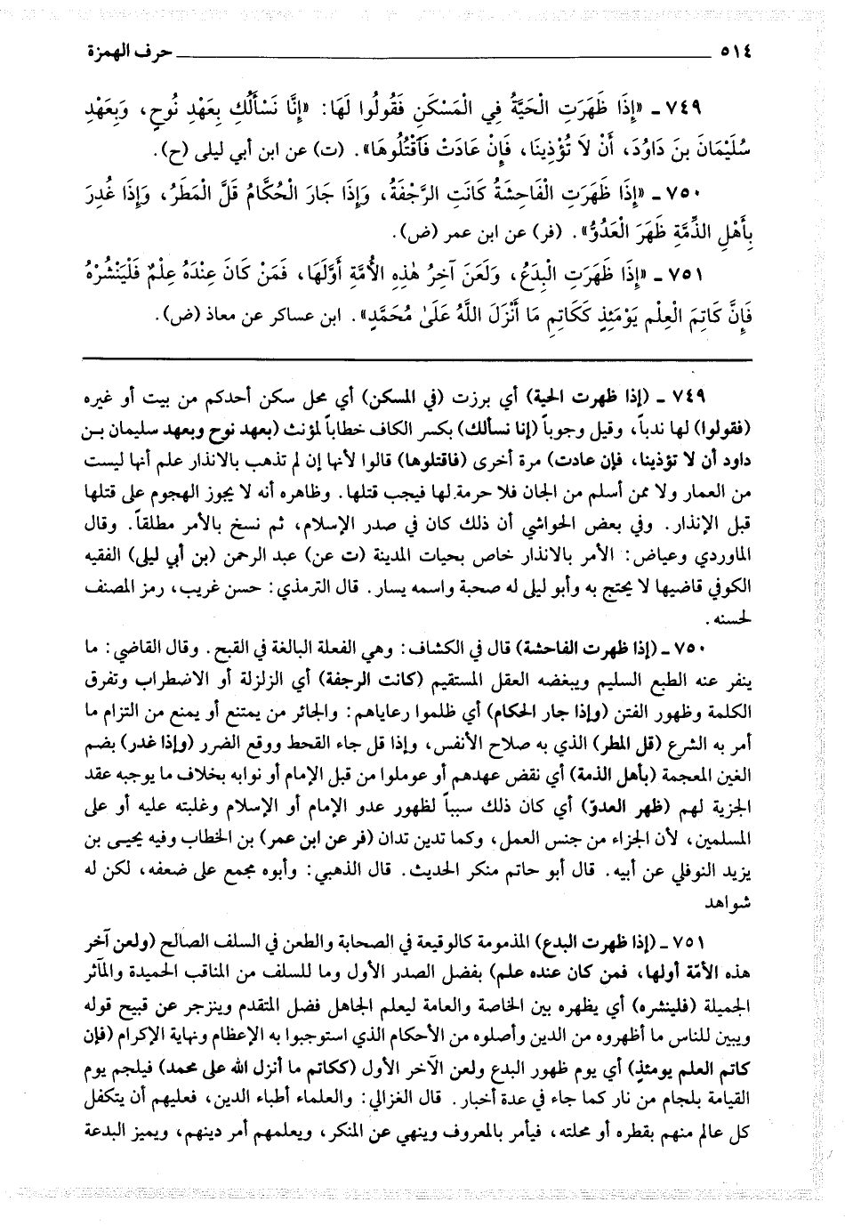 749 - (إذا ظهرت الحية) أي برزت (في المسكن) أي محل سكن أحدكم من بيت أو غيره (فقولوا) لها ندبا ، وقيل وجوبا (إنا نسألك) بكسر الكاف خطابا لمؤنث (بعهد نوح وبعهد سليمان بن داود أن لا تؤذينا فإن عادت) مرة أخرى (فاقتلوها) قالوا لأنها إن لم تذهب بالإنذار علم أنها ليست من العمار ولا ممن أسلم من الجان فلا حرمة لها فيجب قتلها.