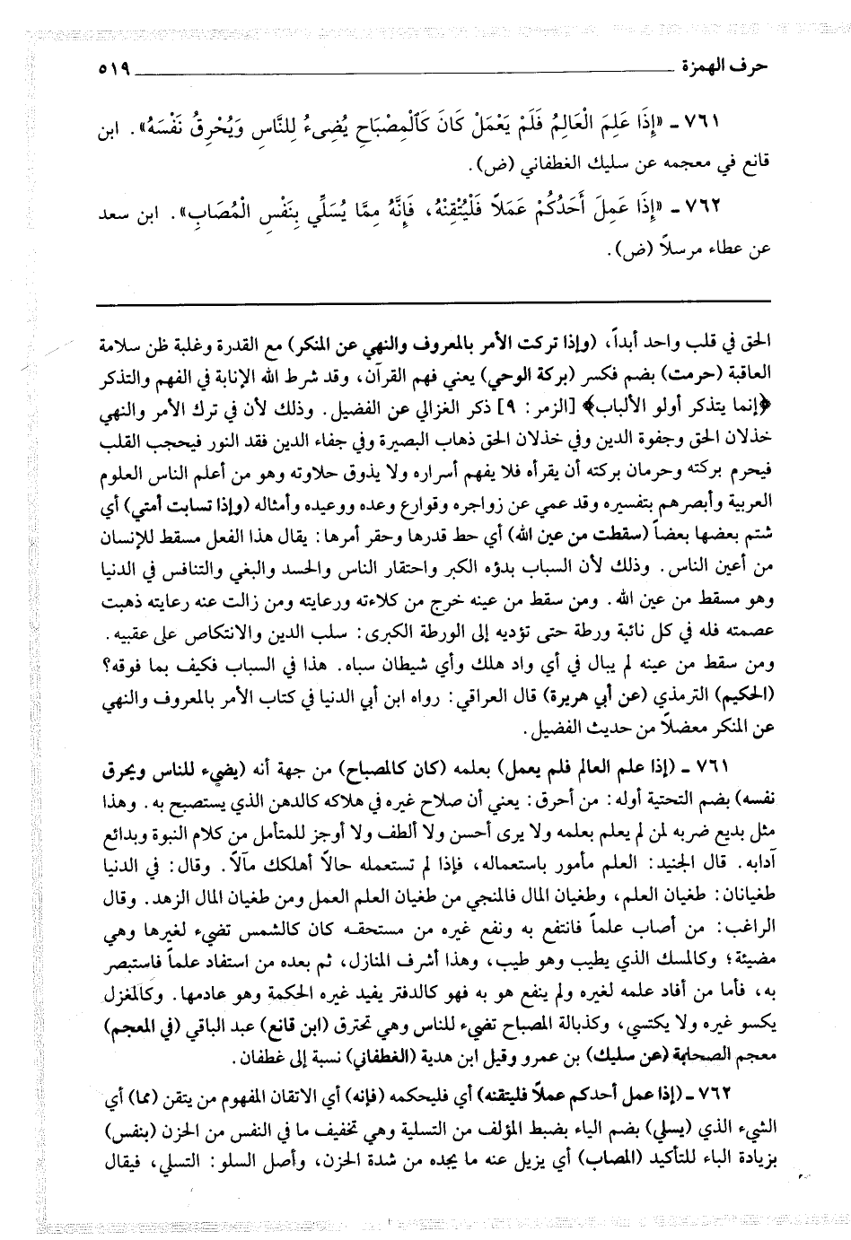 761 - (إذا علم العالم فلم يعمل) بعلمه (كان كالمصباح) من جهة أنه (يضئ للناس ويحرق نفسه) بضم التحتية أوله : من أحرق : يعني أن صلاح غيره في هلاكه كالدهن الذي يستصبح به.