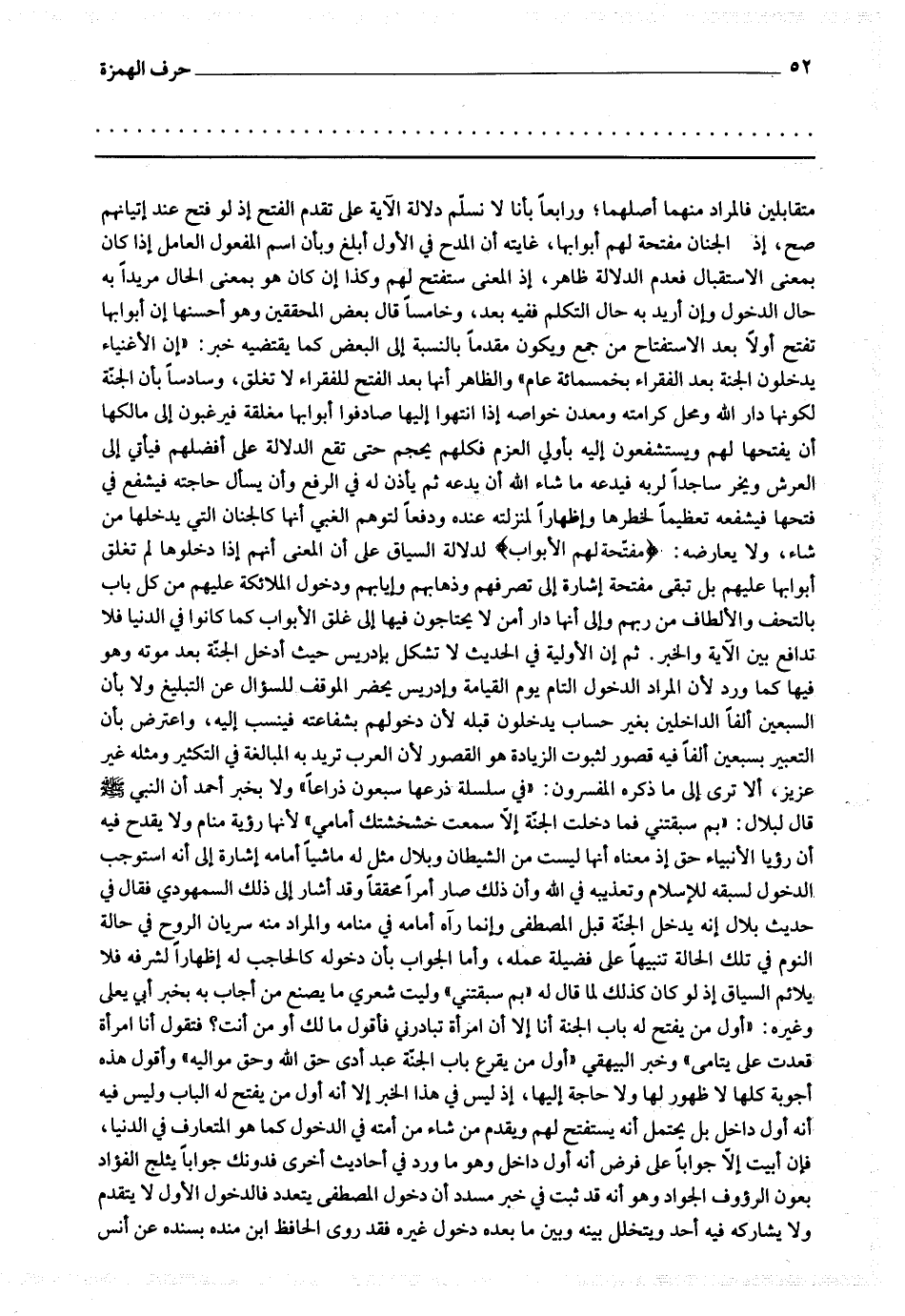التعبير بسبعين ألفا فيه قصور لثبوت الزيادة هو القصور لأن العرب تريد به المبالغة في التكثير ومثله غير كثير ، ألا ترى إلى ما ذكره المفسرون : * (في سلسلة ذرعها سبعون ذراعا) * ولا بخبر أحمد أن النبي صلى الله عليه وسلم قال لبلال : " بم سبقتني فما دخلت الجنة إلا سمعت خشخشتك أمامي " لأنها رؤية منام ولا يقدح فيه أن رؤيا الأنبياء حق إذ معناه أنها ليست من الشيطان وبلال مثل له ماشيا أمامه إشارة إلى أنه استوجب الدخول لسبقه للإسلام وتعذيبه في الله وأن ذلك صار أمرا محققا وقد أشار إلى ذلك السمهودي فقال في حديث بلال إنه يدخل الجنة قبل المصطفى وإنما رآه أمامه في منامه والمراد منه سريان الروح في حالة النوم في تلك الحالة تنبيها على فضيلة عمله ، وأما الجواب بأن دخوله كالحاجب به إظهارا لشرفه فلا يلائم السياق إذ لو كان كذلك لما قال له " بم سبقتني " وليت شعري ما يصنع من أجاب به بخبر أبي يعلى وغيره : " أول من يفتح له باب الجنة أنا إلا أن امرأة تبادرني فأقول مالك أو من أنت ؟ فتقول أنا امرأة قعدت على يتامى " وخبر البيهقي " أول من يقرع باب الجنة عبد أدى حق الله وحق مواليه " وأقول هذه أجوبة كلها لا ظهور لها ولا حاجة إليها ، إذ ليس في هذا الخبر إلا أنه أول من يفتح له الباب وليس فيه أنه أول داخل بل يحتمل أنه يستفتح لهم ويقدم من شاء من أمته في الدخول كما هو المتعارف في الدنيا ، فإن أبيت إلا جوابا على فرض أنه أول داخل وهو ما ورد في أحاديث أخرى فدونك جوابا يثلج الفؤاد بعون الرؤوف الجواد وهو أنه قد ثبت في خبر مسدد أن دخول المصطفى يتعدد فالدخول الأول لا يتقدم ولا يشاركه فيه أحد ويتخلل بينه وبين ما بعده دخول غيره فقد روى الحافظ ابن منده بسنده عن أنس