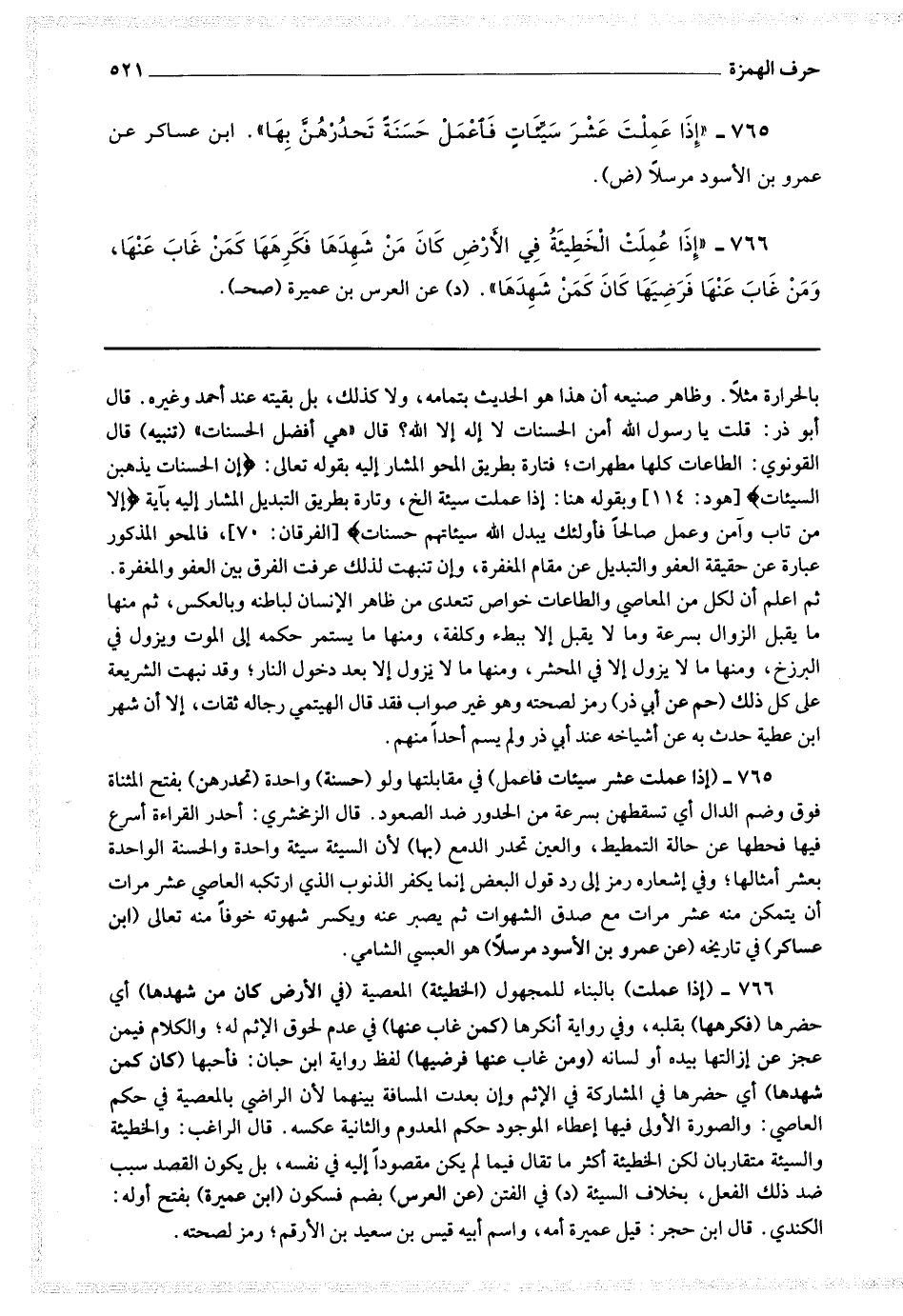 766 - (إذا عملت) بالبناء للمجهول (الخطيئة) المعصية (في الأرض كان من شهدها) أي حضرها (فكرهها) بقلبه ، وفي رواية أنكرها (كمن غاب عنها) في عدم الإثم له ، والكلام فيمن عجز عن إزالتها بيده أو لسانه (ومن غاب عنها فرضيها) لفظ رواية ابن حبان فأحبها (كان كمن شهدها) أي حضرها في المشاركة في الإثم وإن بعدت المسافة بينهما.