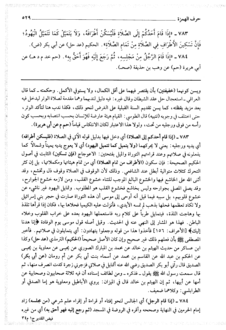 783 - (إذا قام أحدكم إلى الصلاة) أي دخل فيها بدليل قوله الآتي في الصلاة (فليسكن أطرافه) أي يديه ورجليه يعني لا يحركهما (ولا يتميل كما تتميل اليهود) أي لا يعوج يديه يمينا وشمالا كما يفعلونه في صلاتهم وعند قراءتهم التوراة والميل بفتحتين : الاعوجاج (فإن تسكين) الثابت في أصول الحكيم الصحيحة فإن سكون (الأطراف من تمام الصلاة) أي من تمام هيئاتها ومكملانها ، بل إن كثر التحرك كثلاث متوالية أبطل عند الشافعي.