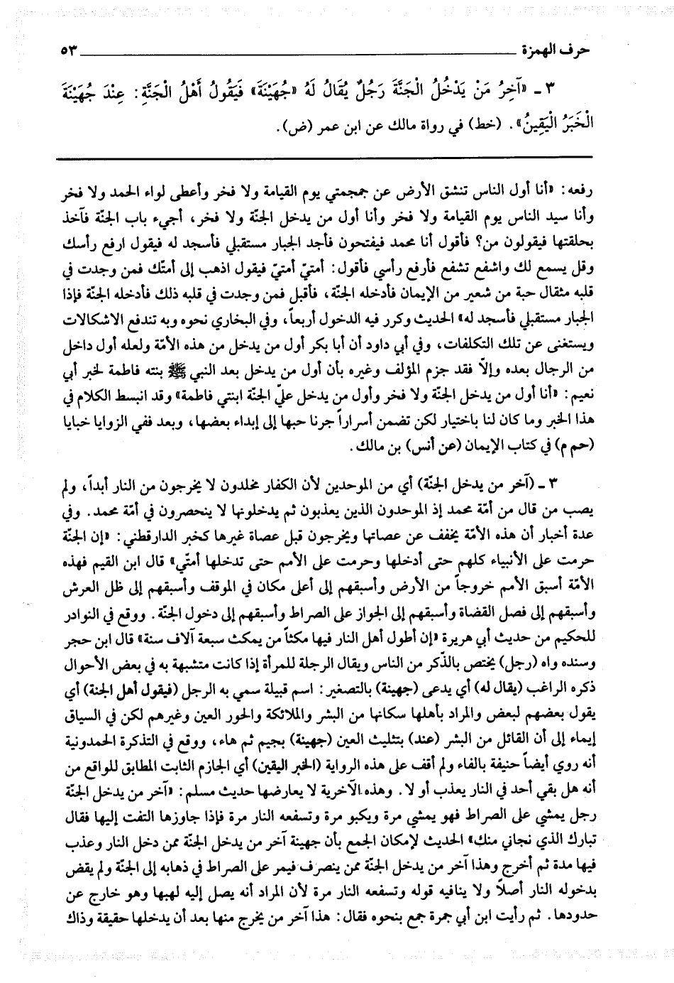 وهذه الآخرية لا يعارضها حديث مسلم : " آخر من يدخل الجنة رجل يمشي على الصراط فهو يمشي مرة ويكبو مرة وتسفعه النار مرة فإذا جاوزها التفت إليها فقال تبارك الذي نجاني منك " الحديث لإمكان الجمع بأن جهينة آخر من يدخل الجنة ممن دخل النار وعذب فيها مدة ثم أخرج وهذا آخر من يدخل الجنة ممن ينصرف فيمر على الصراط في ذهابه إلى الجنة ولم يقض بدخوله النار أصلا ولا ينافيه قوله وتسفعه النار مرة لأن المراد أنه يصل إليه لهبها وهو خارج عن