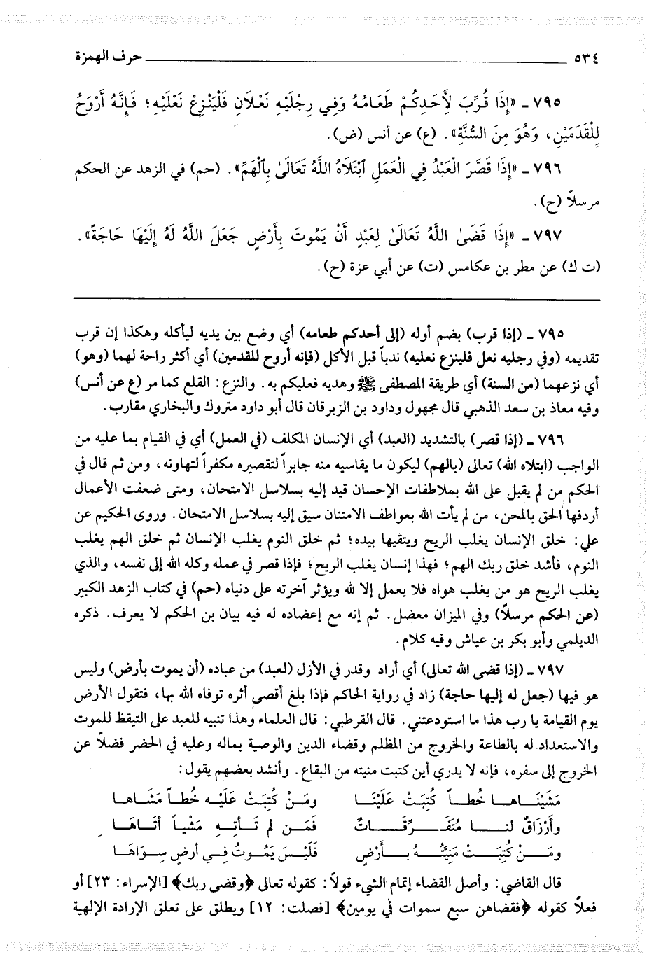 797 - (إذا قضى الله تعالى) أي أراد وقدر في الأزل (لعبد) من عباده (أن يموت بأرض) وليس هو فيها (جعل له إليها حاجة) زاد في رواية الحاكم فإذا بلغ أقصى أثره توفاه الله بها ، فتقول الأرض يوم القيامة يا رب هذا ما استودعتني.