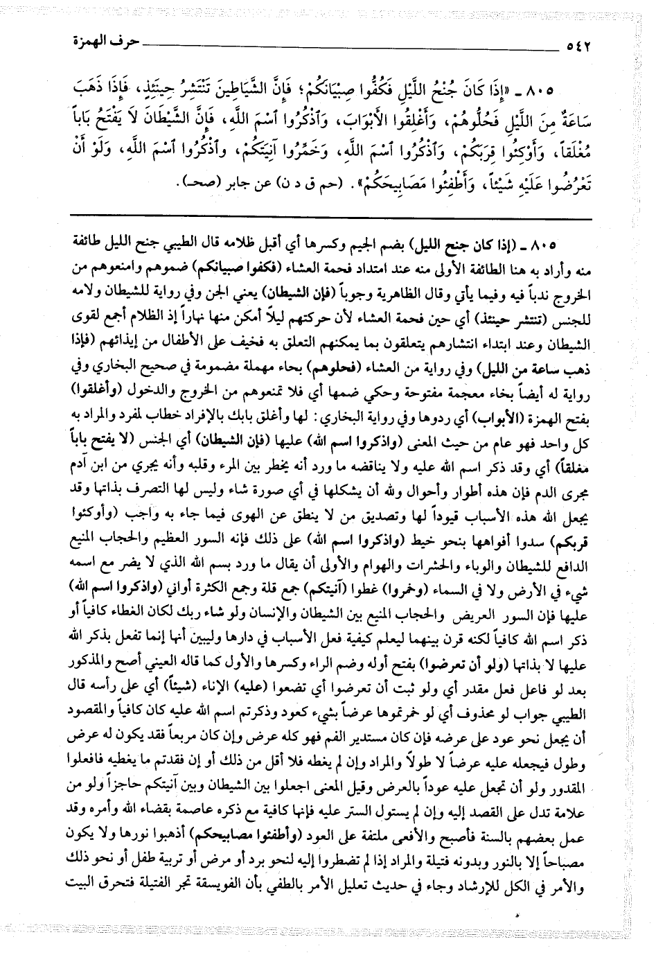 805 - (إذا كان جنح الليل) بضم الجيم وكسرها أي أقبل ظلامه قال الطيبي جنح الليل طائفة منه وأراد به هنا الطائفة الأولى منه عند امتداد فحمة العشاء (فكفوا صبيانكم) ضموهم وامنعوهم من الخروج ندبا فيه وفيما يأتي وقال الظاهرية وجوبا (فإن الشيطان) يعني الجن وفي رواية للشيطان ولامه للجنس (تنتشر حينئذ) أي حين فحمة العشاء لأن حركتهم ليلا أمكن منها نهارا إذ الظلام أجمع لقوى الشيطان وعند ابتداء انتشارهم يتعلقون بما يمكنهم التعلق به فخيف على الأطفال من إيذائهم (فإذا ذهب ساعة من الليل) وفي رواية من العشاء (فحلوهم) بحاء مهملة مضمومة في صحيح البخاري وفي رواية له أيضا بخاء معجمة مفتوحة وحكي ضمها أي فلا تمنعوهم من الخروج والدخول (وأغلقوا) بفتح الهمزة (الأبواب) أي ردوها وفي رواية البخاري لها وأغلق بابك بالإفراد خطاب لمفرد والمراد به كل واحد فهو عام من حيث المعنى (واذكروا اسم الله) عليها (فإن الشيطان) أي الجنس (لا يفتح بابا