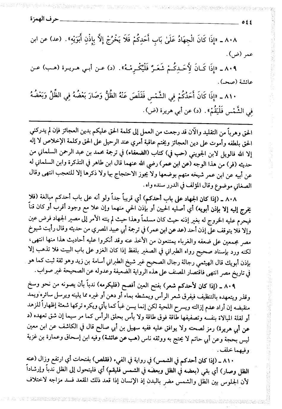 808 - (إذا كان الجهاد على باب أحدكم) أي قريبا جدا ولو أنه على باب أحدكم مبالغة (فلا يخرج إليه إلا بإذن أبويه) أي أصليه الحيين أو بإذن الحي منهما وإن علا مع وجود أقرب أو كان قنا فيحرم عليه الخروج له بغير إذنه حيث كان مسلما وهذا حيث لم ينته الأمر إلى مصير الجهاد فرض عين وإلا فلا يتوقف على إذن أحد (عد عن ابن عمر) في ترجمة أبي عبيد المصري من حديثه وقال رأيت شيوخ مصر مجتمعين على ضعفه والغرباء يمتنعون من الأخذ عنه وقد أنكروا عليه أحاديث هذا منها انتهى لكنه ورد بإسناد صحيح رواه الطبراني في الصغير بلفظ إذا كان الغزو على باب البيت فلا تذهب إلا باذن أبويك.