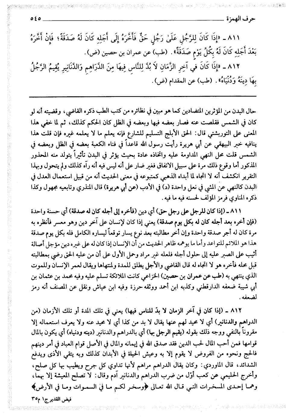 811 - (إذا كان للرجل على رجل حق) أي دين (فأخره إلى أجله كان له صدقة) أي حسنة واحدة (فإن أخره بعد أجله كان بكل يوم صدقة) يعني إذا كان لإنسان على آخر دين وهو معسر فأنظره به مرة كان له أجر صدقة واحدة وإن أخر مطالبته بعد نوع يسار توقيعا ليساره الكامل فله بكل يوم صدقة هذا هو الملائم للتواعد وأما ما يوهمه ظاهر الحديث من أن الإنسان إذا كان له على غيره دين مؤجل أصالة أثيب على الصبر عليه إلى حلول أجله فلعله غير مراد وحمل الأول على أن من عليه الحق رضي بمطالبته قبل محله فأخره هو لا اتجاه له قال القاضي والأجل يطلق للمدة ولمنتهاها ويقال لعمر الإنسان وللموت الذي ينتهي به (طب عن عمران بن حصين) الخزاعي كانت الملائكة تسلم عليه وفيه محمد بن عثمان بن