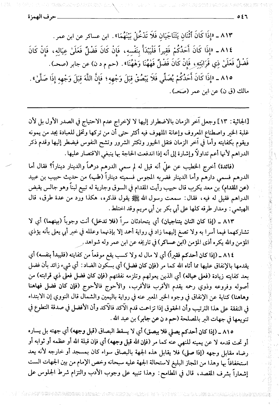 813 - (إذا كان اثنان يتناجيان) أي يتحادثان سرا (فلا تدخل) أنت وجوبا (بينهما) أي لا تشاركهما فيما أسرا به ولا تصغ إليهما زاد في رواية أحمد إلا بإذنهما وعلله في خبر أبي يعلى بأنه يؤذي