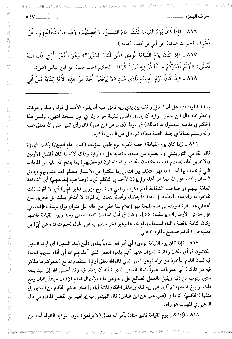 818 - (إذا كان يوم القيامة نادى مناد) بأمر الله تعالى (لا يرفعن) بنون التوكيد الثقيلة أحد من