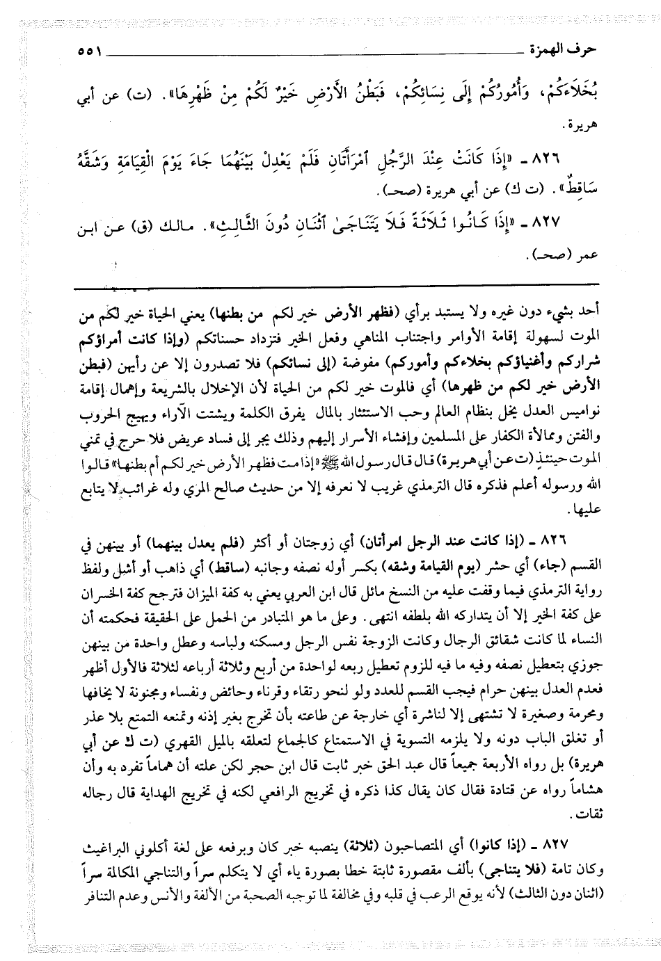 826 - (إذا كانت عند رجل امرأتان) أي زوجتان أو أكثر (فلم يعدل بينهما) أو بينهن في القسم (جاء) أي حشر (يوم القيامة وشقه) بكسر أوله نصفه وجانبه (ساقط) أي ذاهب أو أشل ولفظ رواية الترمذي فيما وقفت عليه من النسخ مائل قال ابن العربي يعني به كفة الميزان فترجح كف الخسران على كفة الخير إلا أن يتداركه الله بلطفه انتهى وعلى ما هو المتبادر من الحمل على الحقيقة فحكمته أن النساء لما كانت شقائق الرجال وكانت الزوجة نفس الرجل ومسكنه ولباسه وعطل واحدة من بينهن جوزي بتعطيل نصفه وفيه ما فيه للزوم تعطيل ربعه لواحدة من أربع وثلاثة أرباعه لثلاثة فالأول أظهر فعدم العدل بينهن حرام فيجب القسم للعدد ولو لنحو رتقاء وقرناء وحائض ونفساء ومجنونة لا يخافها