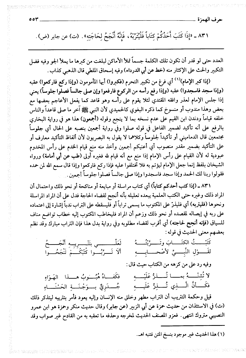 الشيخان بلفظ إنما جعل الإمام ليؤتم به فلا تختلفوا عليه فإذا ركع فاركعوا وإذا قال سمع الله لمن حمده فقولوا ربنا لك الحمد وإذا سجد فاسجدوا وإذا صلى جالسا فصلوا جلوسا أجمعين 831 - (إذا كتب أحدكم كتابا) أي كتاب مراسلة أو مبايعة أو مناكحة أو نحو ذلك واحتمال أن المراد ذلك وغيره حتى الكتب العلمية يبعده تعليله بأنه أنجح لقضاء الحاجة فدل على أن المراد المراسلة ونحوها (فليتربه) أي فليذر على المكتوب ما يسمى ترابا أو فليسقطه على التراب ندبا إشارة إلى اعتماده على ربه في إيصاله لمقصده أو نحو ذلك وزعم أن المراد فليخاطب المكتوب إليه خطاب تواضع مناف للسياق (فإنه أنجح لحاجته) أي لقضاء مطلوبه وفي رواية بدل هذا فإن التراب مبارك وقد نظم بعضهم معنى الحديث في قوله : كتبت الكتاب وتربته * لعلي بتتريبه أنجح لقول النبي لأصحابه * ألا تربوا كتبكم تنجحوا وفيه رد على من كرهه من الكتاب حيث قال : لا تشنه بما تذر عليه * فكفاه هبوب هذا الهواء فكأن الذي تذر عليه * جدري بوجنة الحسناء قيل : وحكمة الترتيب أن التراب مطهر وخلق منه الإنسان وإليه يعود فأمر بتتريبه ليتذكر ذلك.