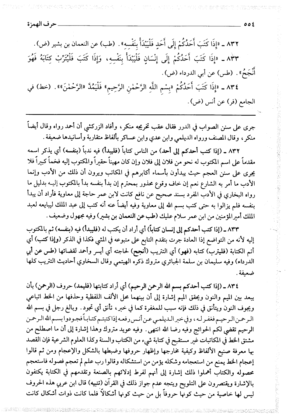 وبالغ رجل في بسم الله الرحمن الرحيم فغفر له ، وفي خبر الديلمي عن أنس رفعه إذا كتبتم كتابا فجودوا بسم الله الرحمن الرحيم تقضى لكم الحوائج وفيه رضا الله انتهى وفيه عويد متروك وهذا إشارة إلى أن ما اصطلح من مشتق الخط في المكاتبات غير مستقبح في كتابة شئ من الكتاب والسنة وكذا العلوم الشرعية فإن القصد بها معرفة صنيع الألفاظ وكيفية مخارجها وإظهار حروفها وضبطها بالشكل والإعجام ومن ثم قالوا إعجام الخط يمنع من استعجامه وكله يؤمن من استشكاله وقالوا رب علم تعجم فصوله فاستعجم محصوله والكتاب أهملوا ذلك إشارة إلى أنهم لفرط إدلائهم بالصنعة وتقديمهم في الكتابة يكتفون بالإشارة ويقتصرون على التلويح ويتجه عدم جواز ذلك في القرآن.