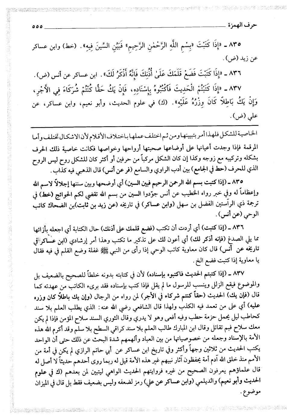 835 - (إذا كتبت بسم الله الرحمن الرحيم فبين السين) أي أوضحها وبين سننها إجلالا لاسم الله وإعظاما له وفي خبر رواه الخطيب عن أنس جودوا السين من بسم الله تقضى لكم الحوائج (خط) في ترجمة ذي الرآستين الفضل بن سهل (وابن عساكر) في تاريخه (عن زيد بن ثابت) ابن الضحاك كاتب الوحي (عن أنس).