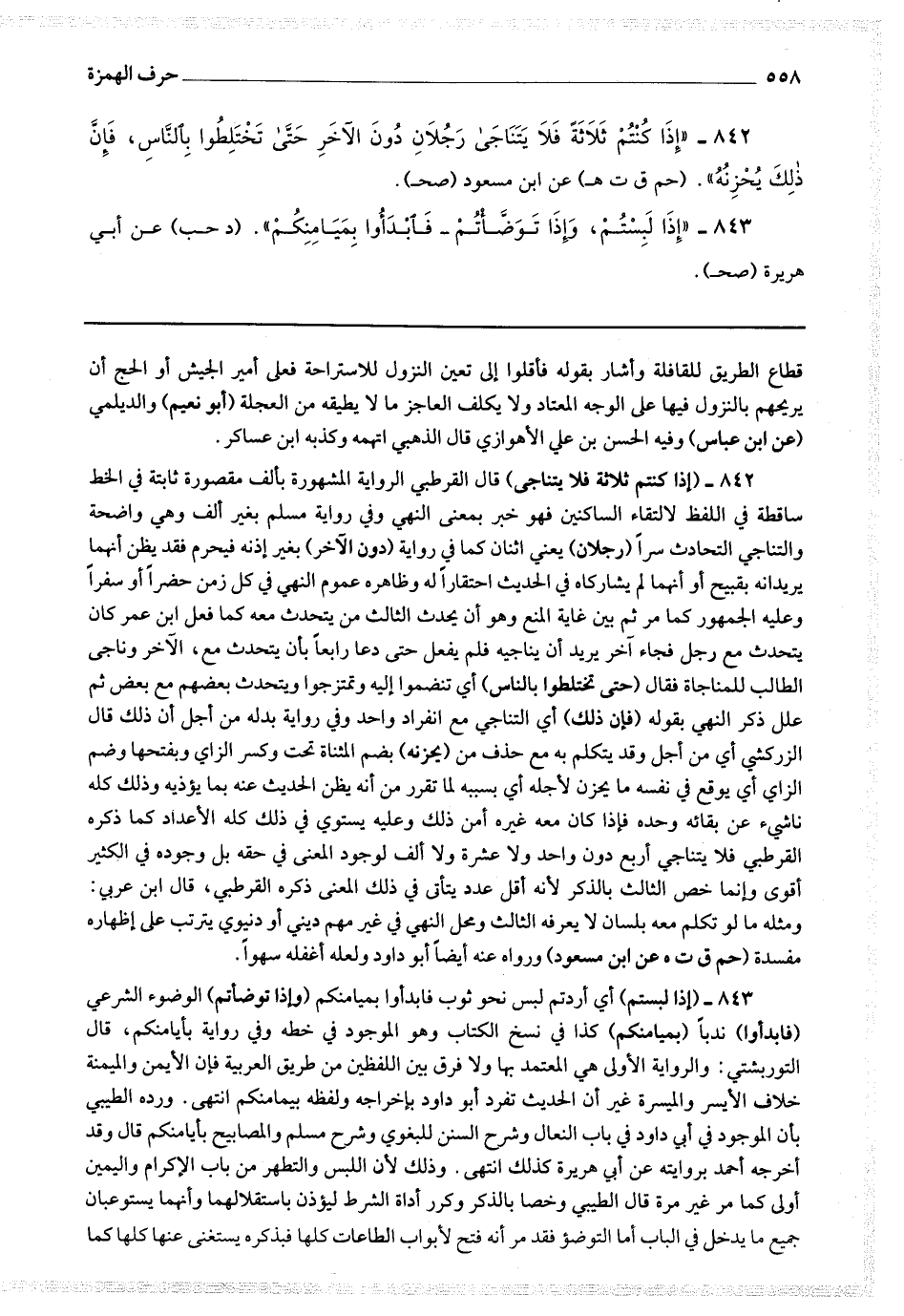 842 - (إذا كنتم ثلاثة فلا يتناجى) قال القرطبي الرواية المشهور بألف مقصورة ثابتة في الخط ساقطة في اللفظ لالتقاء الساكنين فهو خبر بمعنى النهي وفي رواية مسلم بغير ألف وهي واضحة والتناجي التحادث سرا (رجلان) يعني اثنان كما في رواية (دون الآخر) بغير إذنه فيحرم فقد يظن أنهما يريدانه بقبيح أو أنهما لم يشاركاه في الحديث احتقارا له وظاهره عموم النهي في كل زمن حضرا أو سفرا وعليه الجمهور كما مر ثم بين غاية المنع.