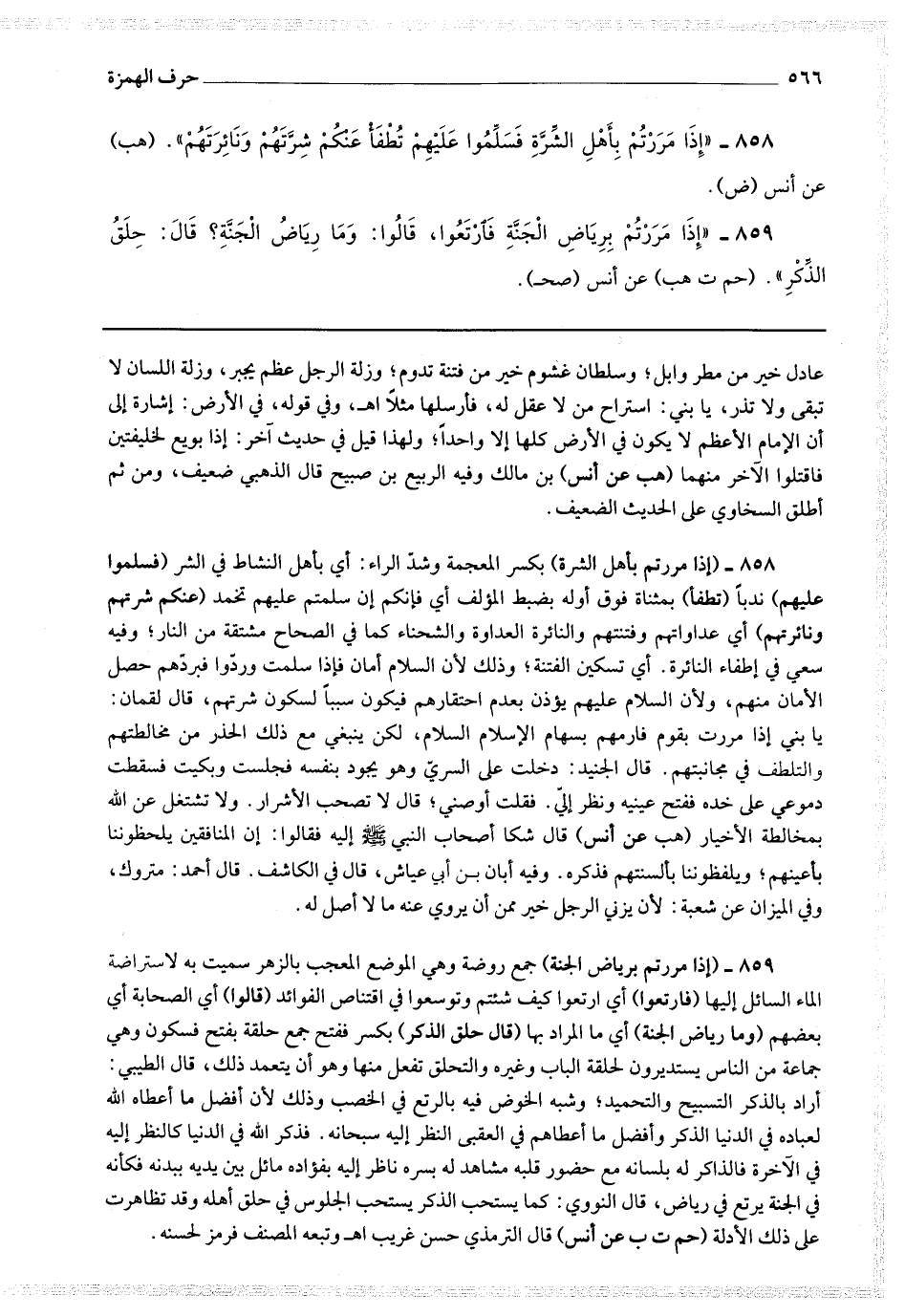 859 - (إذا مررتم برياض الجنة) جمع روضة وهي الموضع المعجب بالزهر سميت به لاستراضة الماء السائل إليها (فارتعوا) أي ارتعوا كيف شئتم وتوسعوا في اقتناص الفوائد (قالوا) أي الصحابة أي بعضهم (وما رياض الجنة) أي ما المراد بها (قال حلق الذكر) بكسر ففتح جمع حلقة بفتح فسكون وهي جماعة من الناس يستديرون لحلقة الباب وغيره والتحلق تفعل منها وهو أن يتعمد ذلك ، قال الطيبي : أراد بالذكر التسبيح والتحميد ، وشبه الخوض فيه بالرتع في الخصب وذلك لأن أفضل ما أعطاه الله لعباده في الدنيا الذكر وأفضل ما أعطاهم في العقبى النظر إليه سبحانه.