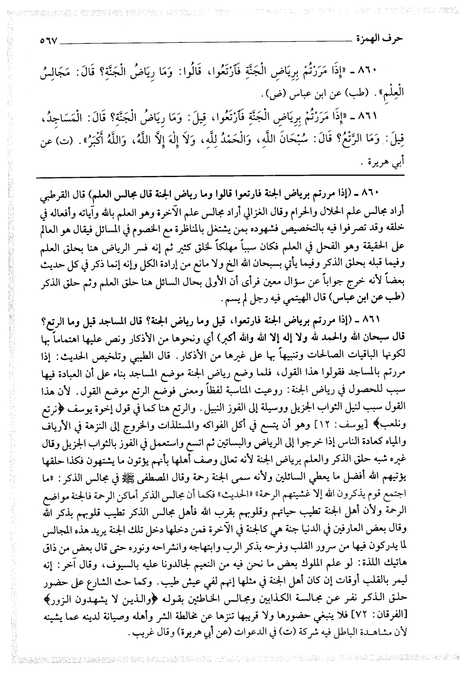 861 - (إذا مررتم برياض الجنة فارتعوا ، قيل وما رياض الجنة ؟ قال المساجد قيل وما الرتع ؟ قال سبحان الله والحمد لله ولا إله إلا الله والله أكبر) أي ونحوها من الأذكار ونص عليها اهتماما بها لكونها الباقيات الصالحات وتنبيها بها على غيرها من الأذكار.
