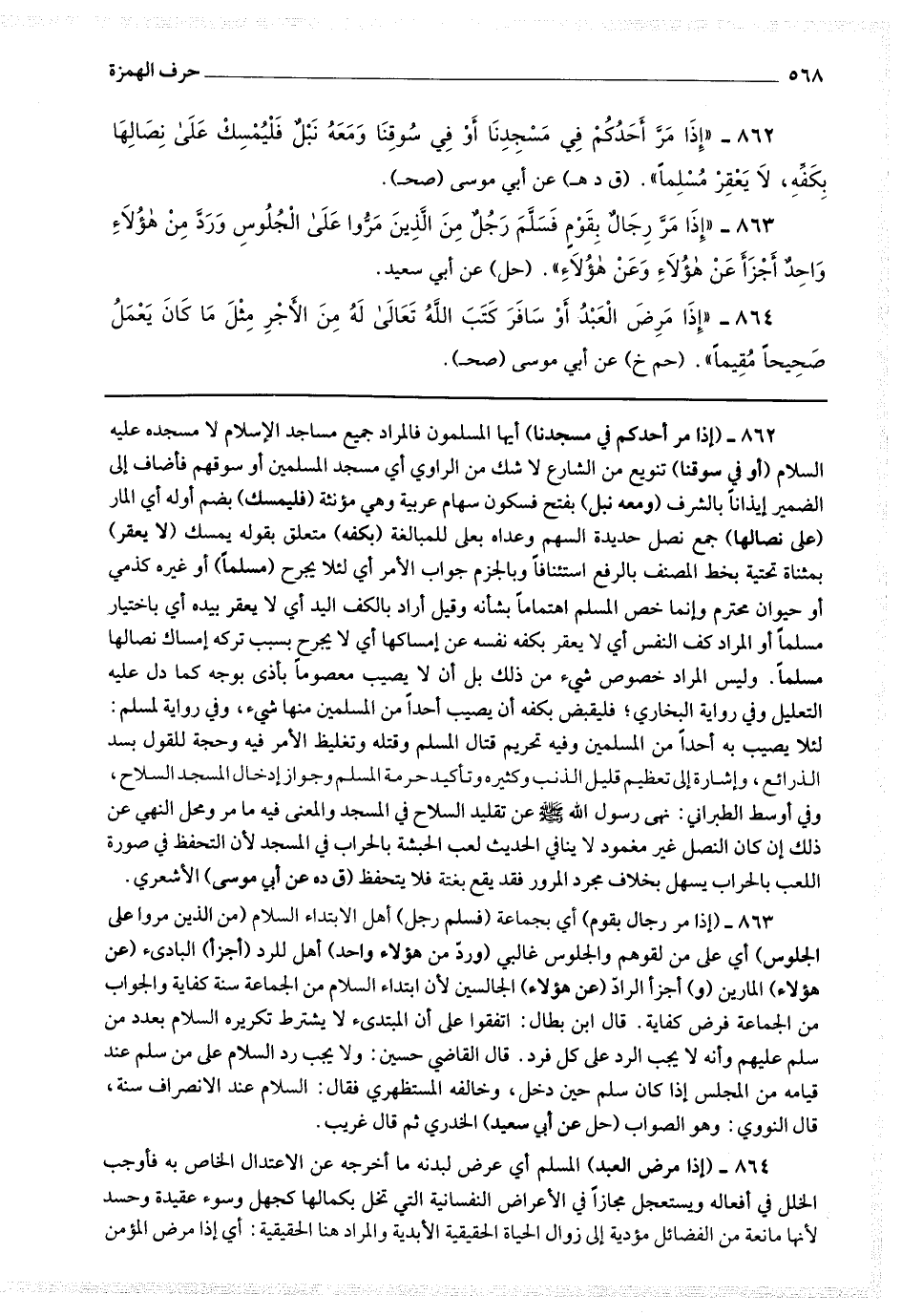 862 - (إذا مر أحدكم في مسجدنا) أيها المسلمون فالمراد جميع مساجد الإسلام لا مسجده عليه السلام (أو في سوقنا) تنويع من الشارع لا شك من الراوي أي مسجد المسلمين أو سوقهم فأضاف إلى الضمير إيذانا بالشرف (ومعه نبل) بفتح فسكون سهام عربية وهي مؤنثة (فليمسك) بضم أوله أي المار (على نصالها) حمع نصل حديدة السهم وعداه بعلى للمبالغة (بكفه) متعلق بقوله يمسك (لا يعقر) بمثناة تحتية بخط المصنف بالرفع استئنافا وبالجزم جواب الأمر أي لئلا يجرح (مسلما) أو غيره كذمي