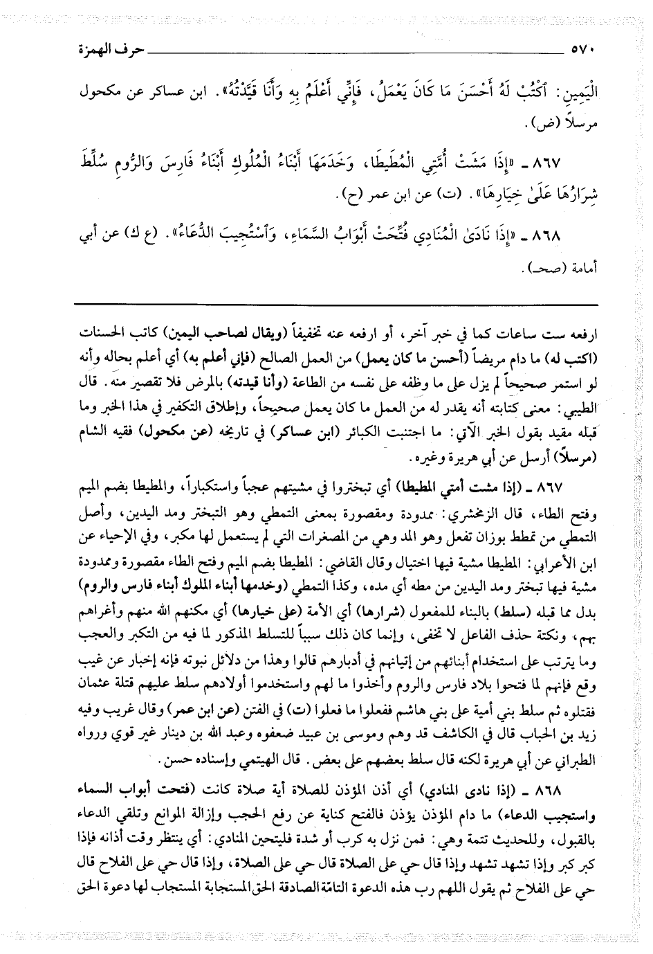868 - (إذا نادى المنادى) أي أذن المؤذن للصلاة أية صلاة كانت (فتحت أبواب السماء واستجيب الدعاء) ما دام المؤذن فالفتح كناية عن رفع الحجب وإزالة الموانع وتلقي الدعاء بالقبول ، وللحديث تتمة وهي : فمن نزل به كرب أو شدة فليتحين المنادي : أي ينتظر وقت أذانه فإذا كبر كبر وإذا تشهد تشهد وإذا قال حي على الصلاة قال حي على الصلاة ، وإذا قال حي على الفلاح قال حي على الفلاح ثم يقول : اللهم رب هذه الدعوة التامة الصادقة الحق المستجابة المستجاب لها دعوة الحق