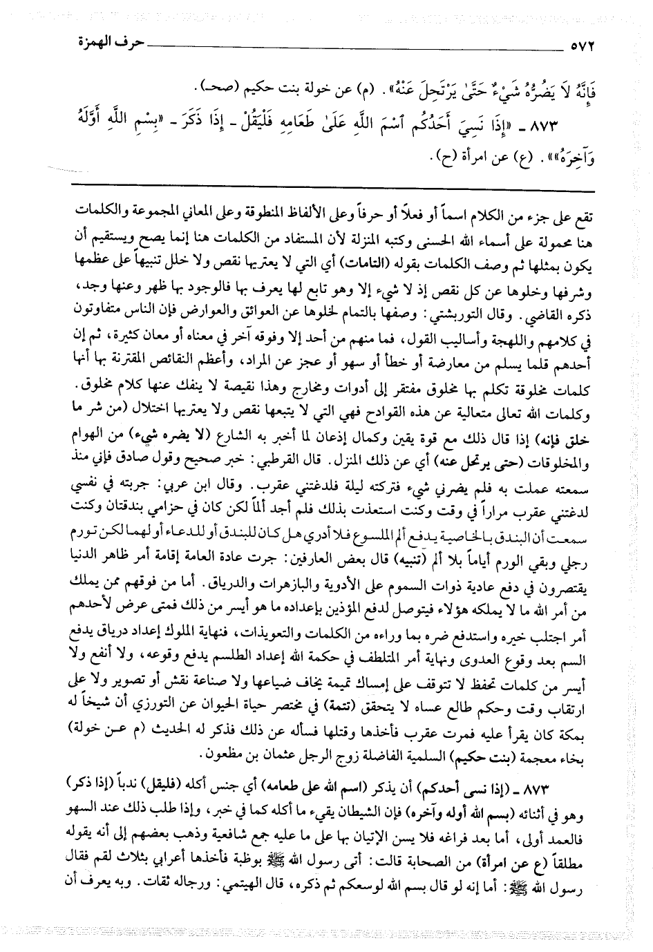 873 - (إذا نسي أحدكم) أن يذكر (اسم الله على طعامه) أي جنس أكله (فليقل) ندبا (إذا ذكر) وهو في أثنائه (بسم الله أوله وآخره) فإن الشيطان يقئ ما أكله كما في خبر ، وإذا طلب ذلك عند السهو فالعمد أولى ، أما بعد فراغه فلا يسن الإتيان بها على ما عليه جمع شافعية وذهب بعضهم إلى أنه يقوله مطلقا (ع عن امرأة) من الصحابة قالت : أتى رسول الله صلى الله عليه وسلم بوظبة فأخذها أعرابي بثلاث لقم فقال رسول الله صلى الله عليه وسلم أما إنه لو قال بسم الله لوسعكم ثم ذكره ، قال الهيتمي : ورجاله ثقات.