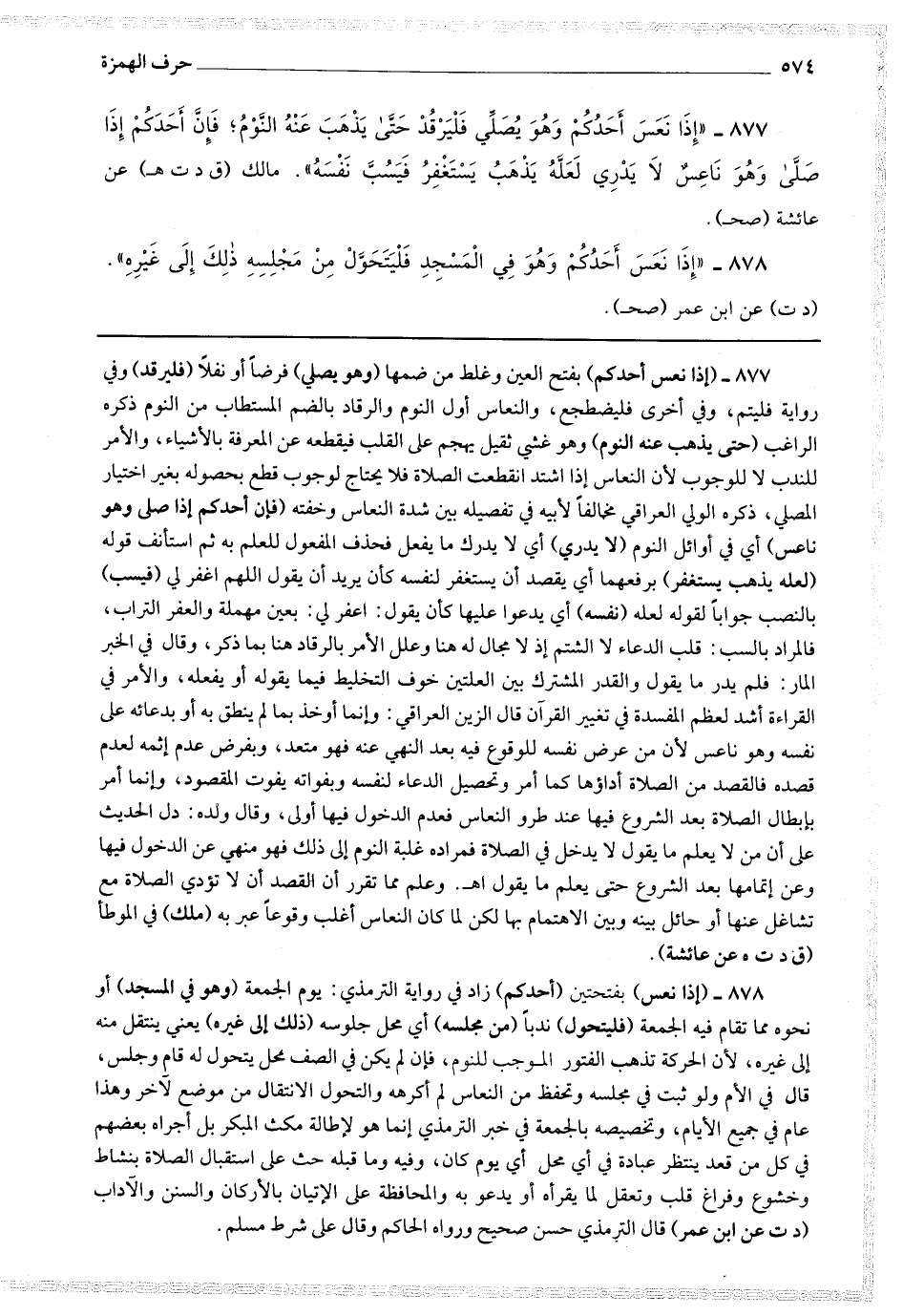 877 - (إذا نعس أحدكم) بفتح العين وغلط من ضمها (وهو يصلي) فرضا أو نفلا (فليرقد) وفي رواية فلينم ، وفي أخرى فليضطجع ، والنعاس أول النوم والرقاد بالضم المستطاب من النوم ذكره الراغب (حتى يذهب عنه النوم) وهو غشي ثقيل يهجم على القلب فيقطعه عن المعرفة بالأشياء ، والأمر