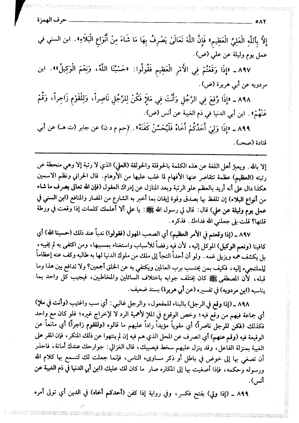897 - (إذا وقعتم في الأمر العظيم) أي الصعب المهول (فقولوا) ندبا عند ذلك (حسبنا الله) أي كافينا (ونعم الوكيل) الموكل إليه ، لأن فيه رفضا للأسباب واستغناء بمسببها ، ومن اكتفى به لم يخيبه ، بل يكشف همه ويزيل غمه.