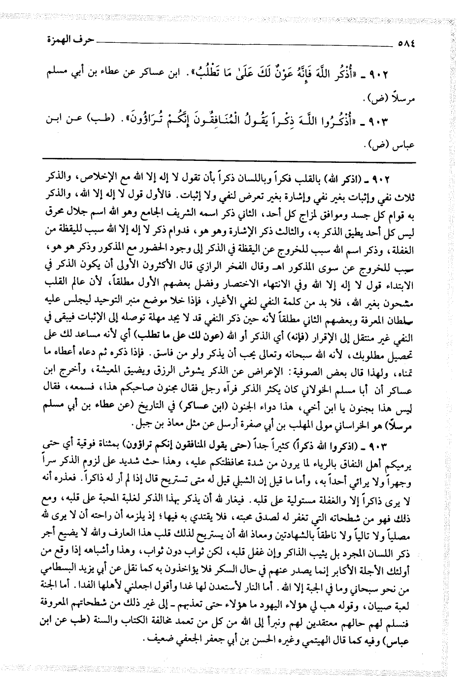 902 - (اذكر الله) بالقلب فكرا وباللسان ذكرا بأن تقول لا إله إلا الله مع الإخلاص ، والذكر ثلاث نفي وإثبات بغير نفي وإشارة بغير تعرض لنفي ولا إثبات.