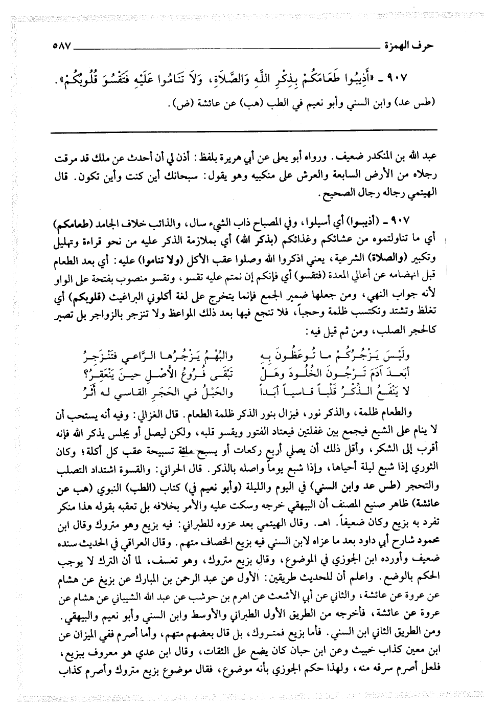 907 - (أذيبوا) أي اسيلوا ، وفي المصباح ذاب الشئ سال ، والذائب خلاف الجامد (طعامكم) أي ما تناولتموه من عشائكم وغذائكم (بذكر الله) أي بملازمة الذكر عليه من نحو قراءة وتهليل وتكبير (والصلاة) الشرعية ، يعني اذكروا الله وصلوا عقب الأكل (ولا تناموا) عليه : أي بعد الطعام قبل انهضامه عن أعالي المعدة (فتقسو) أي فإنكم إن نمتم عليه تقسو ، وتقسو منصوب بفتحة على الواو لأنه جواب النهي ، ومن جعلها ضمير الجمع فإنما يتخرج على لغة أكلوني البراغيث (قلوبكم) أي تغلط وتشتد وتكتسب ظلمة وحجبا ، فلا تنجع فيها بعد ذلك المواعظ ولا تنزجر بالزواجر بل تصير كالحجر الصلب ، ومن قيل فيه :