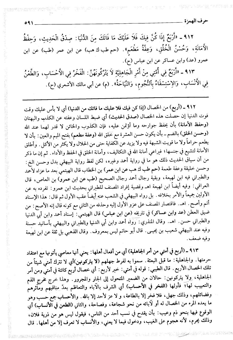 912 - (أربع) من الخصال (إذا كن فيك فلا عليك ما فاتك من الدنيا) أي لا بأس عليك وقت فوت الدنيا إن حصلت هذه الخصال (صدق الحديث) أي ضبط اللسان وعفته عن الكذب والبهتان (وحفظ الأمانة) بأن يحفظ جوارحه وما اؤتمن عليه ، فإن الكذوب والخائن لا قدر لهما عند لله (وحسن الخلق) بالضم بأن يكون حسن العشرة مع خلق الله (وعفة مطعم) بفتح الميم والعين : بأن لا يطعم حراما ولا ما قويت الشبهة فيه ولا يزيد عن الكفاية حتى من الحلال ولا يكثر من الأكل.