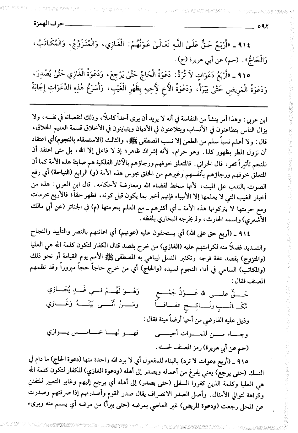 914 - (أربع حق على الله) أي يستحقون عليه (عونهم) أي إعانتهم بالنصر والتأييد والنجاح والتسديد فضلا منه لكرامتهم عليه (الغازي) من خرج بقصد قتال الكفار لتكون كلمة الله هي العليا (والمتزوج) بقصد عفة فرجه وتكثير النسل ليباهي به المصطفى صلى الله عليه وسلم الأمم يوم القيامة أو نحو ذلك (والمكاتب) الساعي في أداء النجوم لسيده (والحاج) أي من خرج حاجا حجا مبرورا وقد نظمهم المصنف فقال : حق على الله عون جمع * وهو لهم في غد يجازي مكاتب وناكح عفافا * ومن أتى بيته وغازي وذيل عليه الفارضي من أحيا أرضا ميتة فقال : وجا من للموات أحي * فهو لها خامس يوازي (حم عن أبي هريرة) رمز المصنف لحسنه.